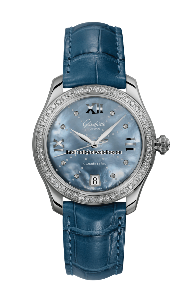 Lady Serenade in blue: this ladies’ watch is a timeless classic with an automatic movement, blue mother-of-pearl dial and leather strap.