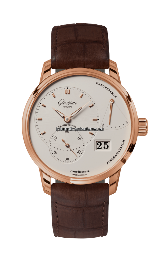 Asymmetry and harmony: The PanoReserve. A red gold watch with silver dial, Panorama Date, power reserve display, small second, brown leather strap.