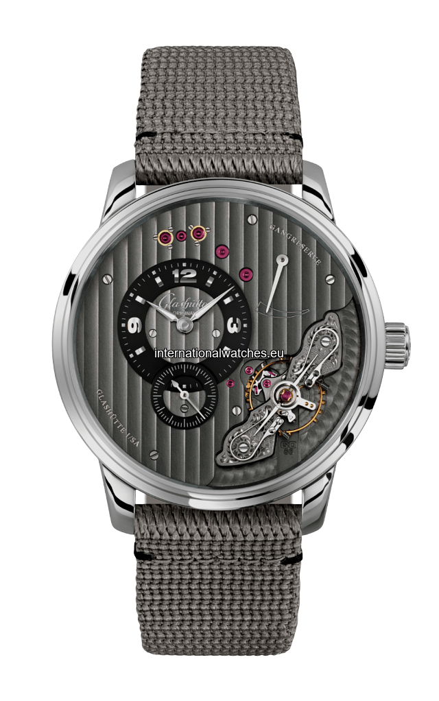 The PanoInvers impresses with an unusual design. Manual winding watch with power reserve display, small second and grey synthetic strap.