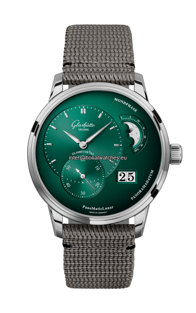 The PanoMaticLunar combines an asymmetrical design with clarity and elegance. Stainless steel, green dial, Panorama Date, moon phase, grey synthetic strap.