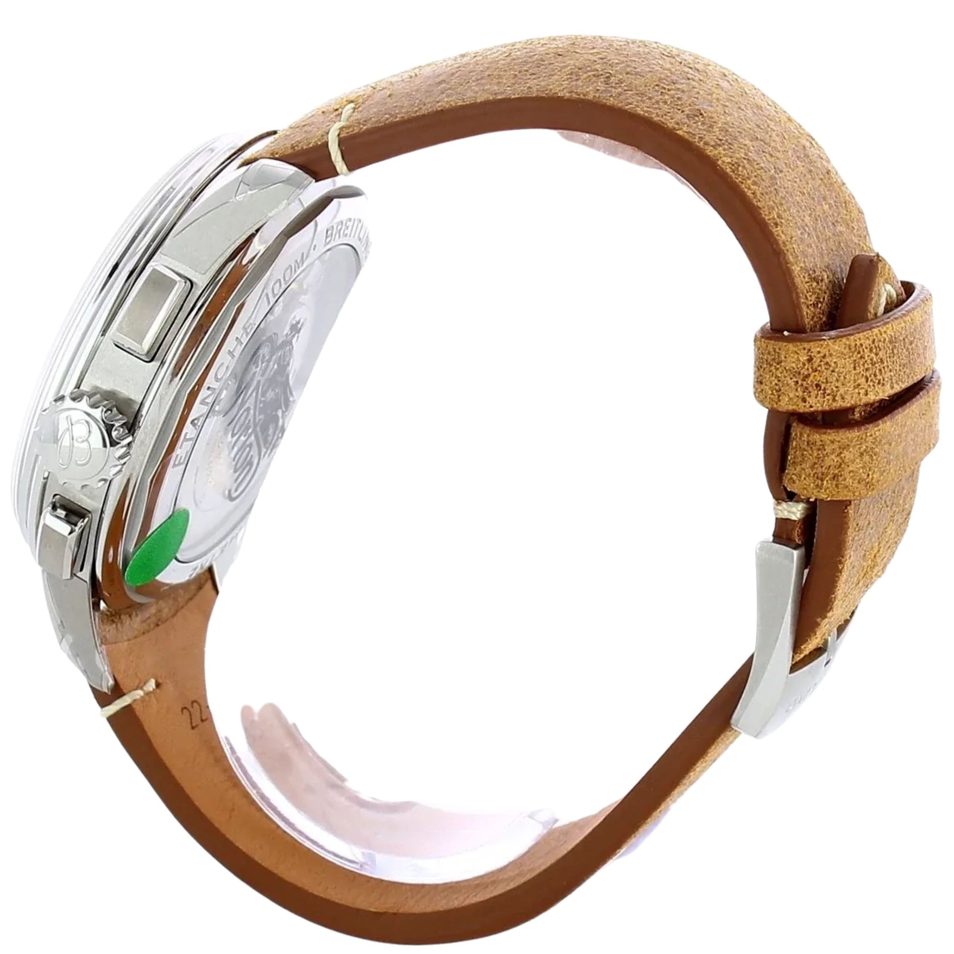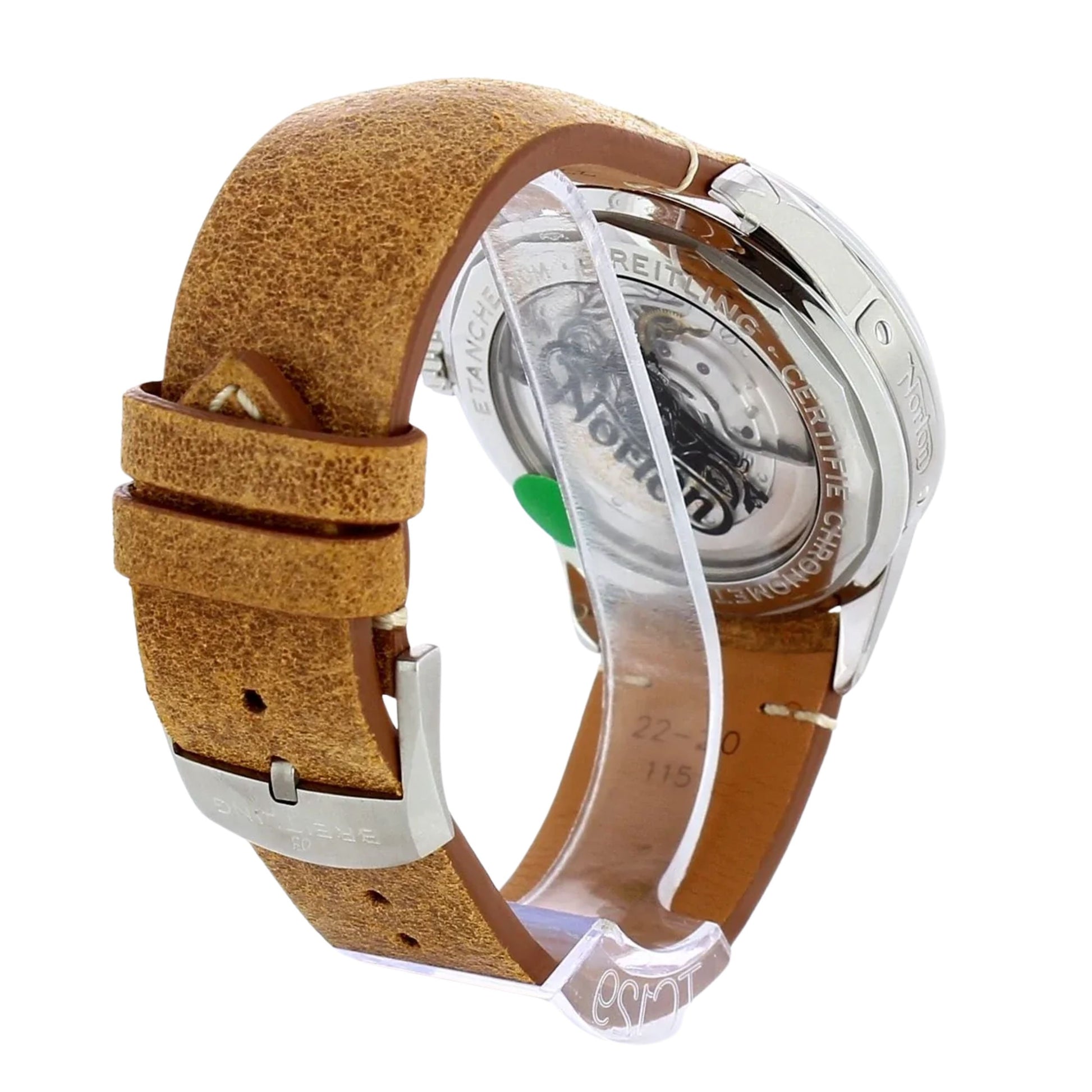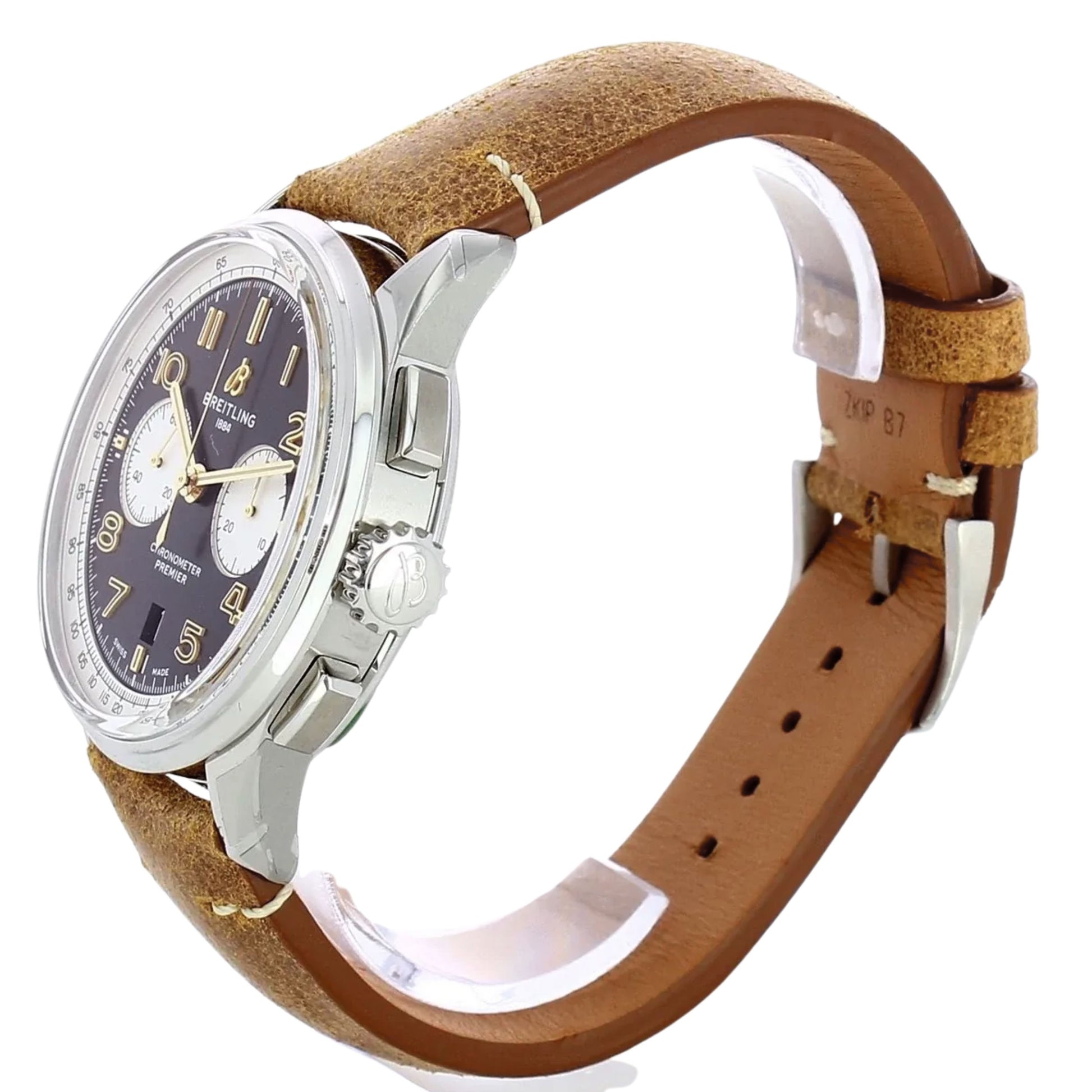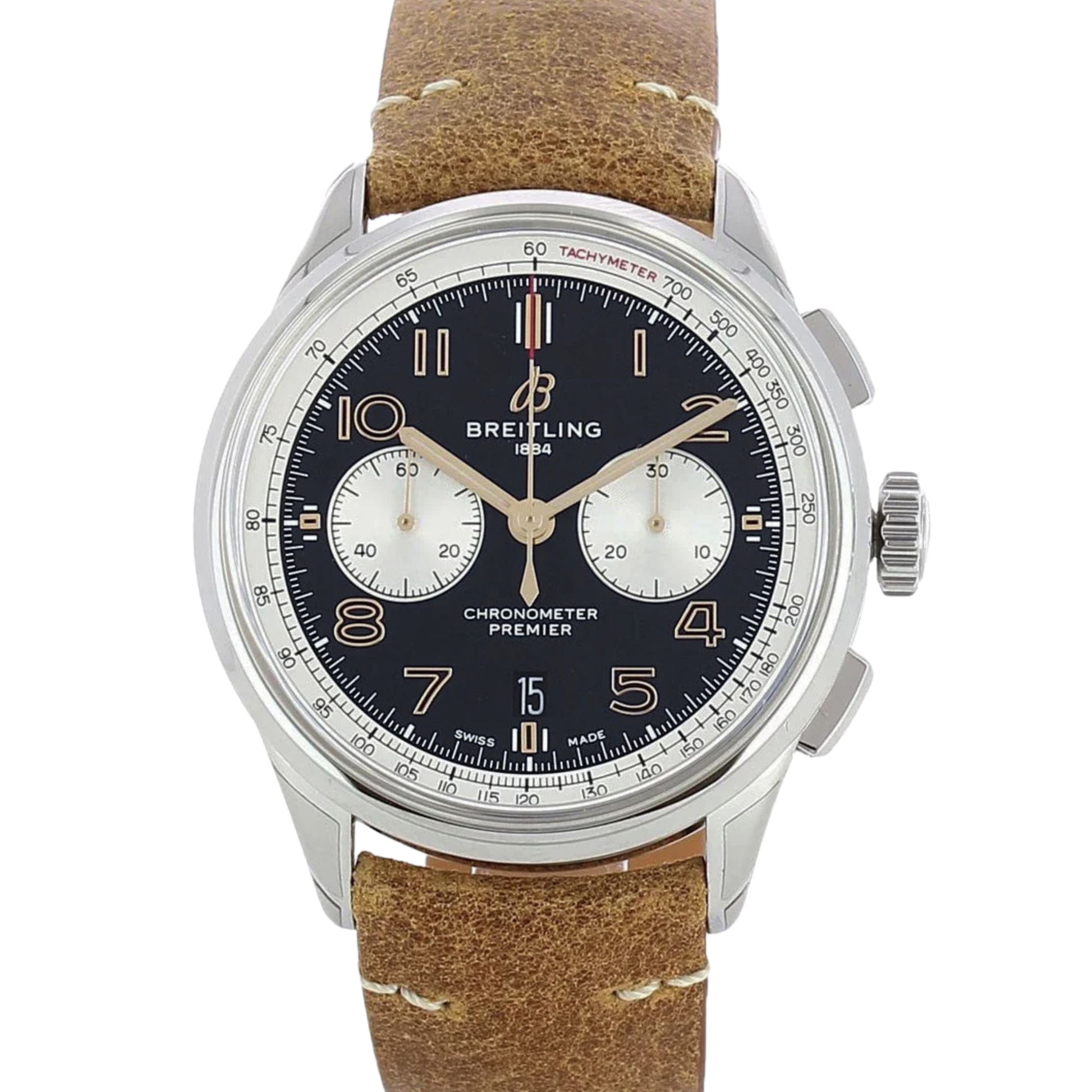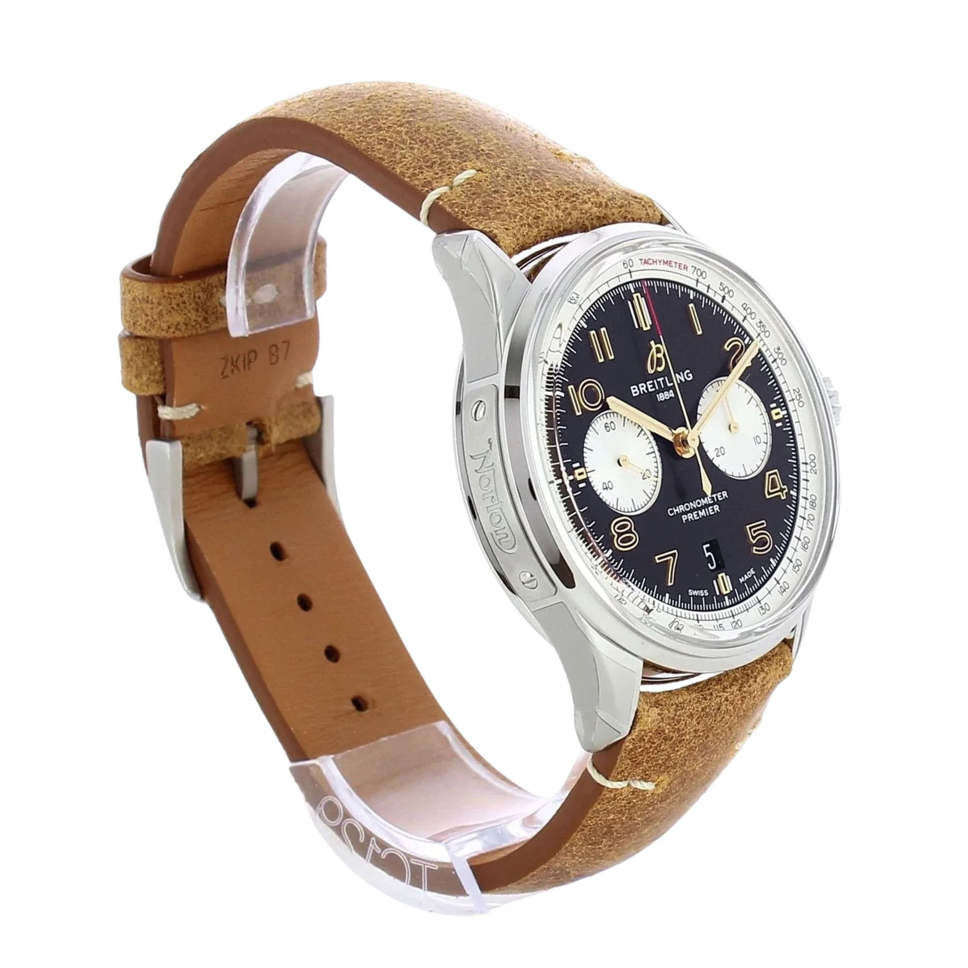 This Premier Norton has a stainless steel case and a brown calfskin leather strap. Black dial with two white sub-dials. Arabic numerals. 6 o'clock window. Chronograph with 30 minute secondary dial at 3 o'clock and 60 seconds dial at 9 o'clock. The Breitling Caliber B01 has an approximate power reserve of 70 hours. Â