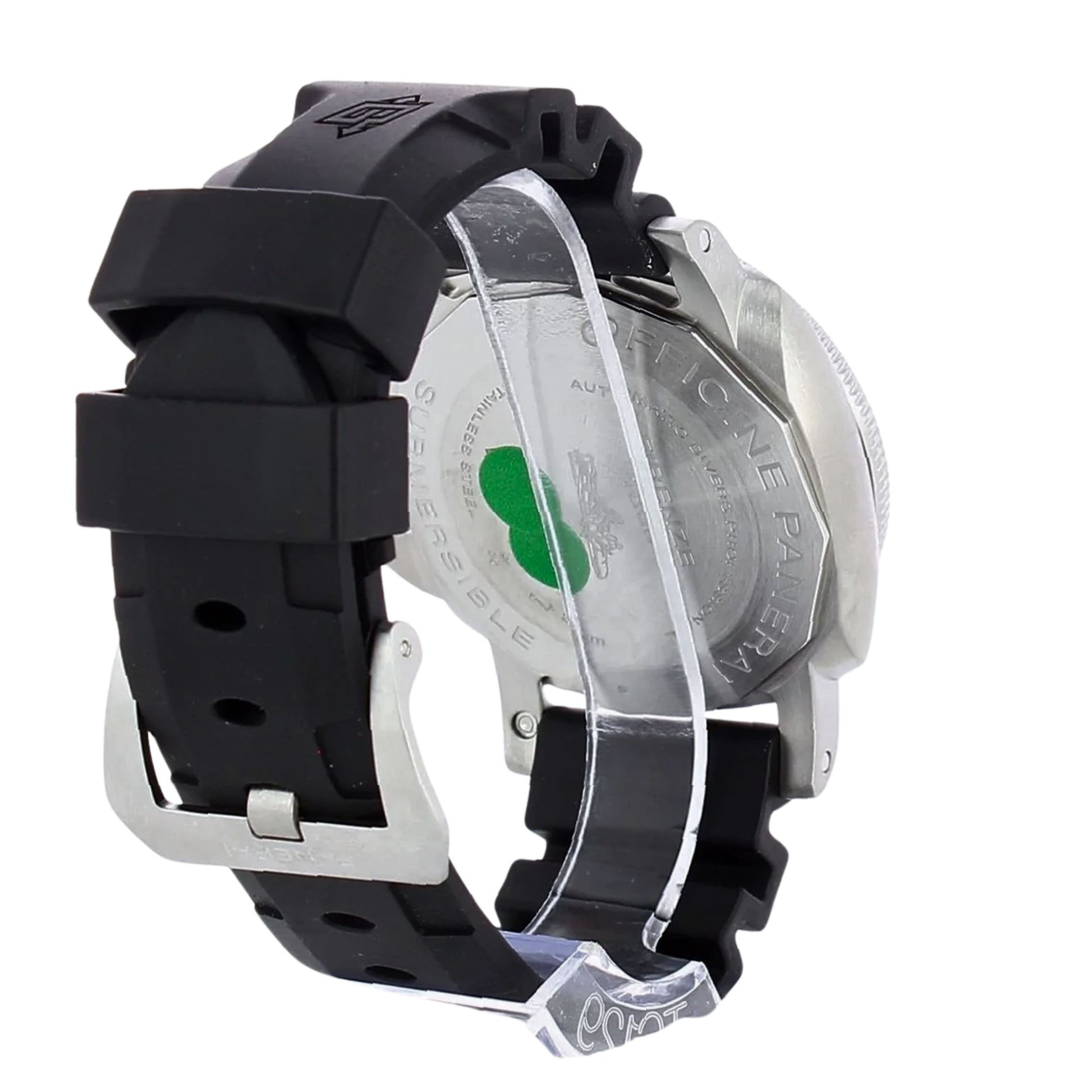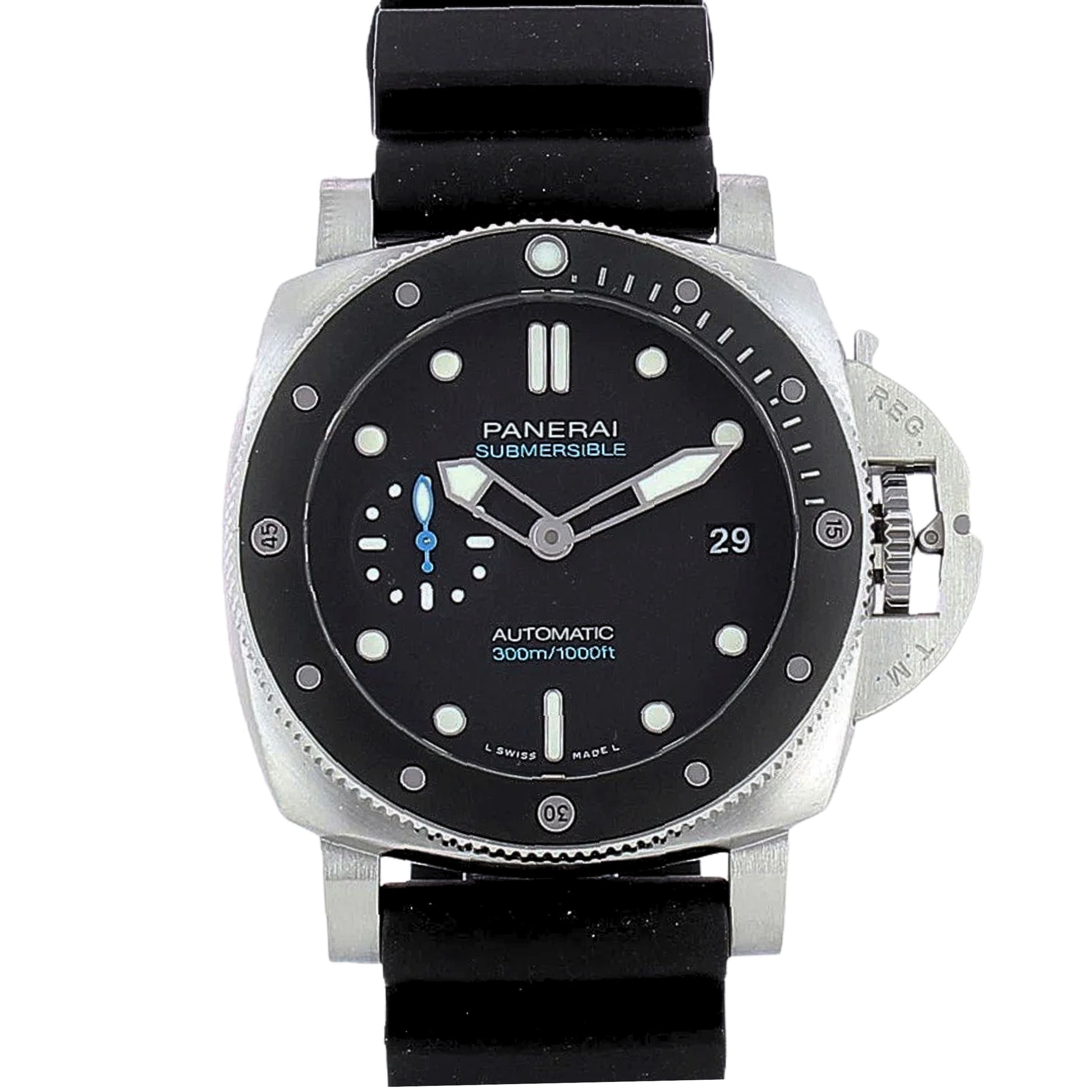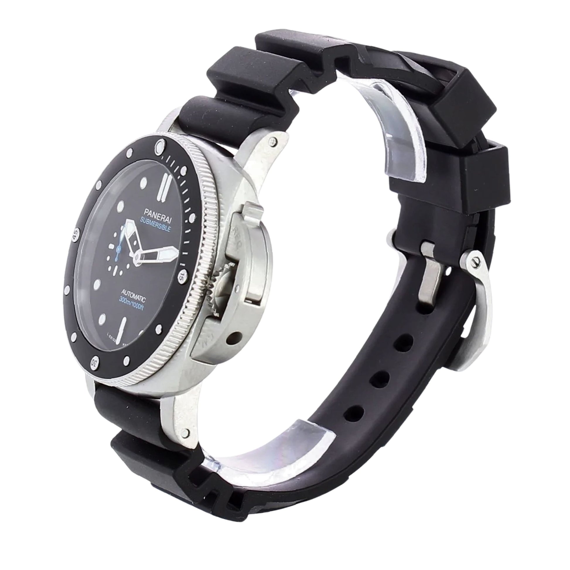 This Submersible was introduced at the SIHH 2019. This watch has a stainless steel case with a black rubber strap. Rotating bezel in ceramic. Black dial with silver tone hands and index and dot hour markers. Luminescent hands and markers. Date display at the 3 o\'clock position. Small seconds display at the 9 o\'clock position. Panerai Caliber OP XXXIV has a power reserve of 72 hours. Ref. 683