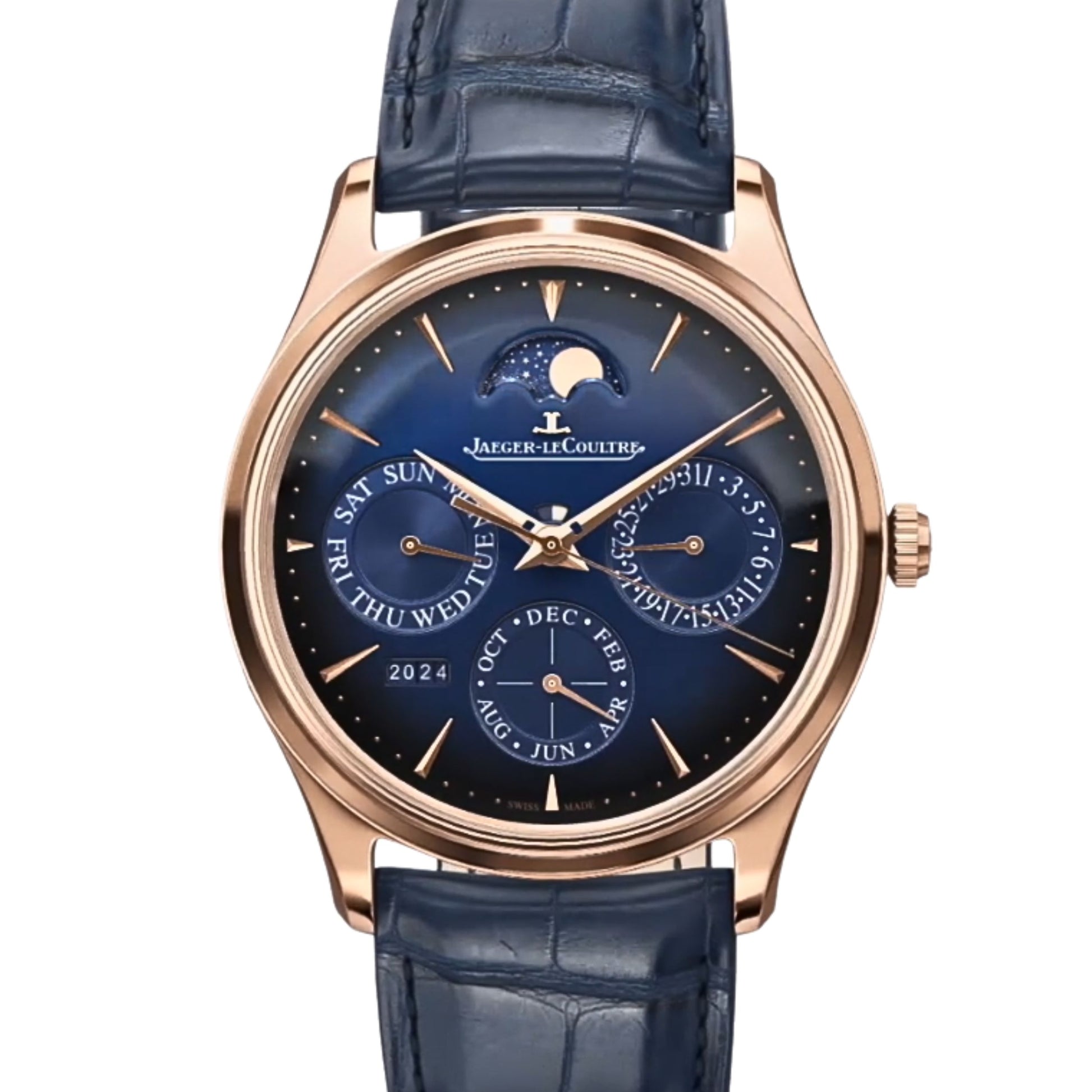Part of the Master Ultra Thin Collection, this complication watch captivates with the finesse of its polished pink gold case and the depth of color of its dial. An intense midnight blue that brings out every detail of the Master Ultra Thin Perpetual Calendar: moon phase at noon, applied hour-markers and JL logo, polished and satin-finished golden hands, sub-dials with a double opaline finish on the outside and azure on the inside... the sapphire crystal back of this perpetual calendar reveals its movement, Calibre 868, manufactured, decorated and assembled within the Manufacture, offering 70 hours of power reserve.