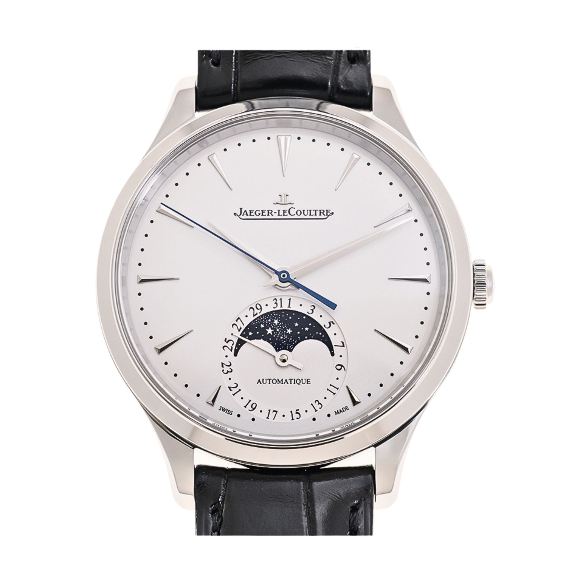 The Master Ultra Thin collection embodies the perfect combination of technical mastery and aesthetic understatement. With a 36mm diameter case in steel, the Master Ultra Thin Moon with a sunrayed silver dial pays tribute to the Moon Phase complication. On a deep midnight blue background, the moon and stars sparkle with majesty. The watch houses the Jaeger-LeCoultre Calibre 925 with a power reserve of 70 hours.