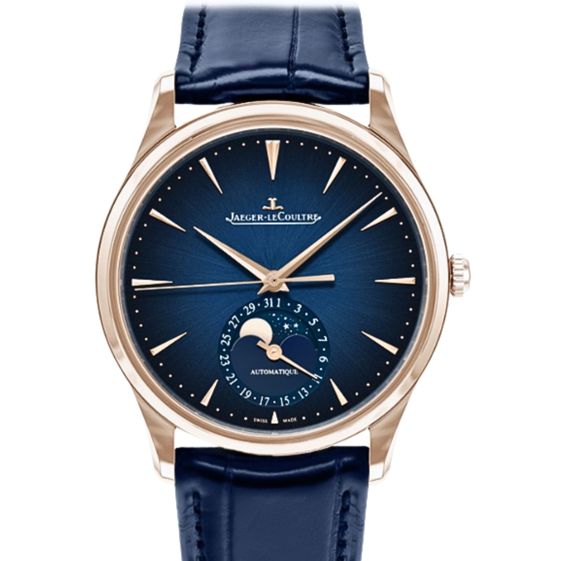 a deep, intense, slightly smoky blue. With a design that is as complex as it is meticulous, this gradient midnight blue echoes the deep blue alligator leather strap. This chromatic statement divinely contrasts the pink gold polished case with profiled lugs, the applied indexes, the Dauphine hands and the minute track. A window at 6 o'clock displays the moon phase — an emblematic complication of the Master Ultra Thin collection — which finds its home amidst the bewitching background of blue shades. The aesthetic balance is remarkable. Entirely created, decorated and assembled within the Manufacture, the self-winding Jaeger-LeCoultre Calibre 925 promises 70 hours of power reserve.