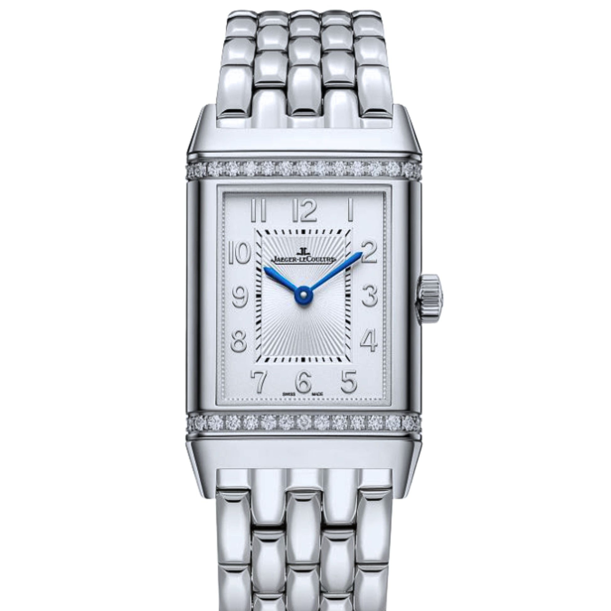 The Reverso Duetto’s distinctive and refined aesthetic on both sides makes a strong visual impression. In the tradition of the first Reverso models, the Art Deco-style front features an opaline and sunrayed guilloché finish with diamond-set gadroons. On the reverse, the contrasting sunray and guilloché texture of the lacquered blue dial brings out every detail: hour markers forming celestial rays, the number 12, Dauphine hands and a double row of brilliant-cut diamonds... At the heart of the Reverso Duetto, Manufacture Calibre 968 brings the Duetto concept to life, with a double set of hands turning in opposite directions indicating the same time.