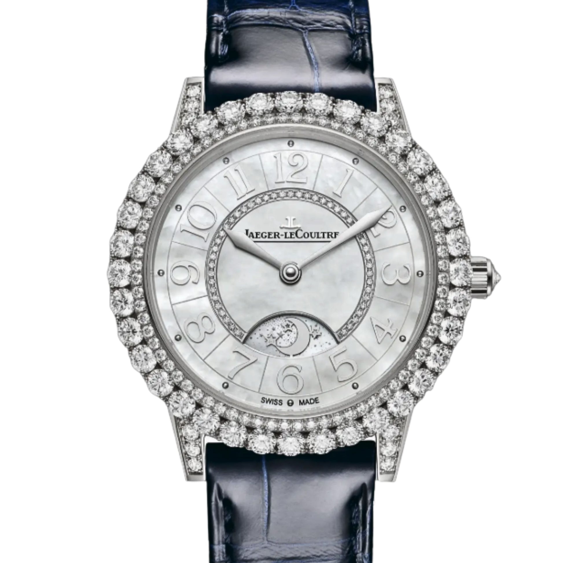 In displaying the iconic codes of the Rendez-Vous collection, this jewellery watch boasts an irresistible evening outfit. Dressed in mother-of-pearl, white gold and diamonds, the new Dazzling Rendez-Vous Night & Day watch is dressed in a sumptuous décor to rival the iconic function that gives this timepiece its name. A debut for this collection, the claw gem-setting of its bezel sparkles with the brilliance of its diamonds, which appear to reflect infinitely on the mother-of-pearl dial.