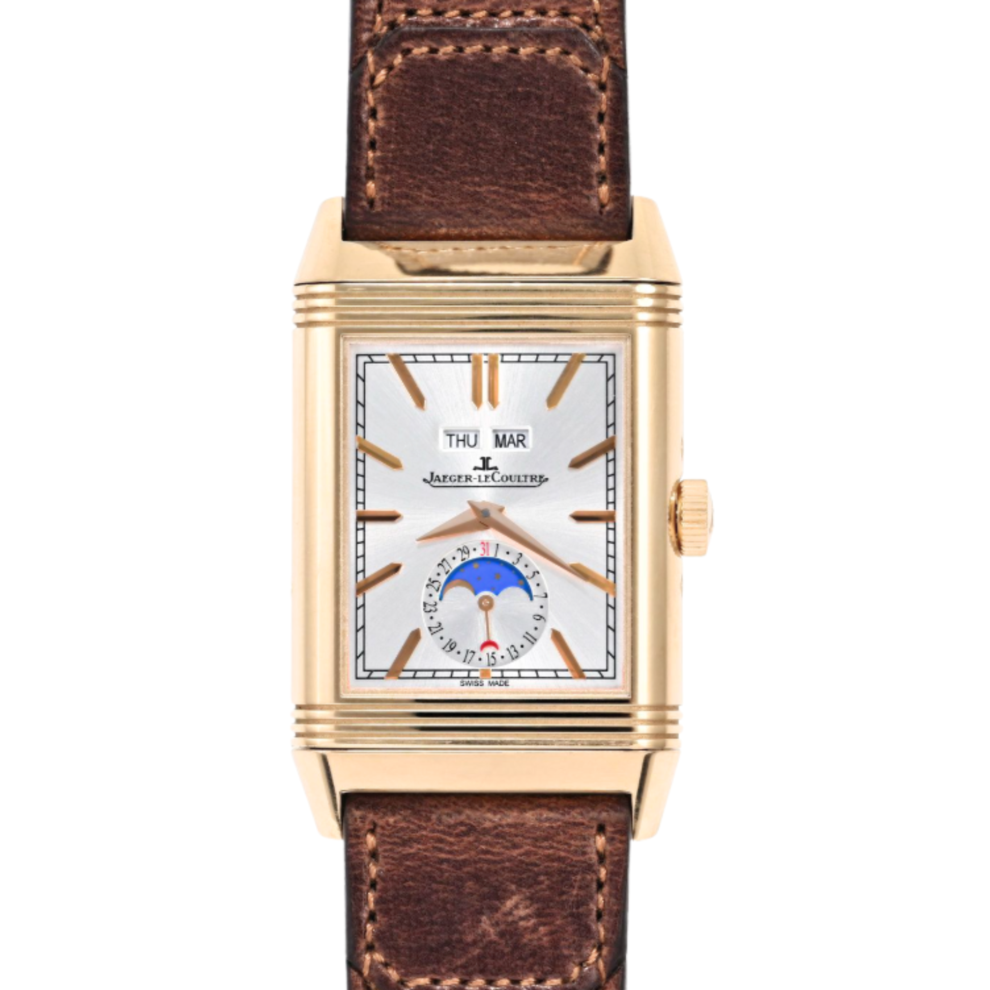 Equipped with the Manufacture Calibre 853 with manual winding, combining the Duoface with a complete calendar, the Reverso Tribute Duoface Calendar offers a magnificent contrast on both sides. On the front, the watch reinterprets the aesthetic codes of the Art Deco-inspired collection launched in 1931 with elegance and refinement: iconic gadroons, applied hour-markers, Dauphine hands... At 6 o'clock, the moon phase is adorned with a discreet hand featuring a bright red crescent-shaped tip to indicate the date. On the reverse, a new dial with a sunray finish features a bewitching dark gray color and a Night/Day disc, perfectly integrated into the new décoration. Elegant and timeless, the watch comes with a pair of interchangeable bracelets (and buckle) designed by Casa Fagliano. In leather or dual material (fabric and leather), they lend the model a strong vintage character.