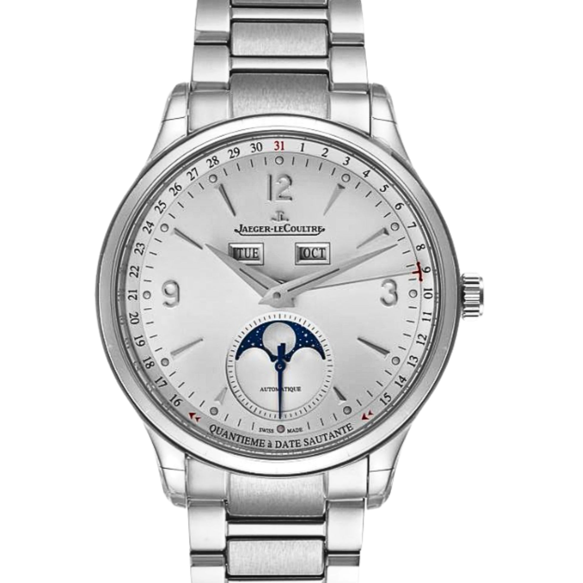 Featuring a 40-mm case, curved lugs, Dauphine hands and appliqué hour-markers, the new Master Control Calendar embodies the watchmaking spirit of this signature collection, achieving a subtle balance between technical prowess and contemporary aesthetics. On this model which boasts a complete calendar, the date indications (day and month) appear in blue in two apertures situated in the center of the dial, while the moon phase comes to life at 6 o'clock. Thanks to a new interchangeability system, the Master Control Calendar is available with two straps: One in stainless steel and the other in Novonappa® calfskin with a folding clasp. This duo of straps changes the look of the watch, effortlessly adapting from a casual look to a more sophisticated elegance.