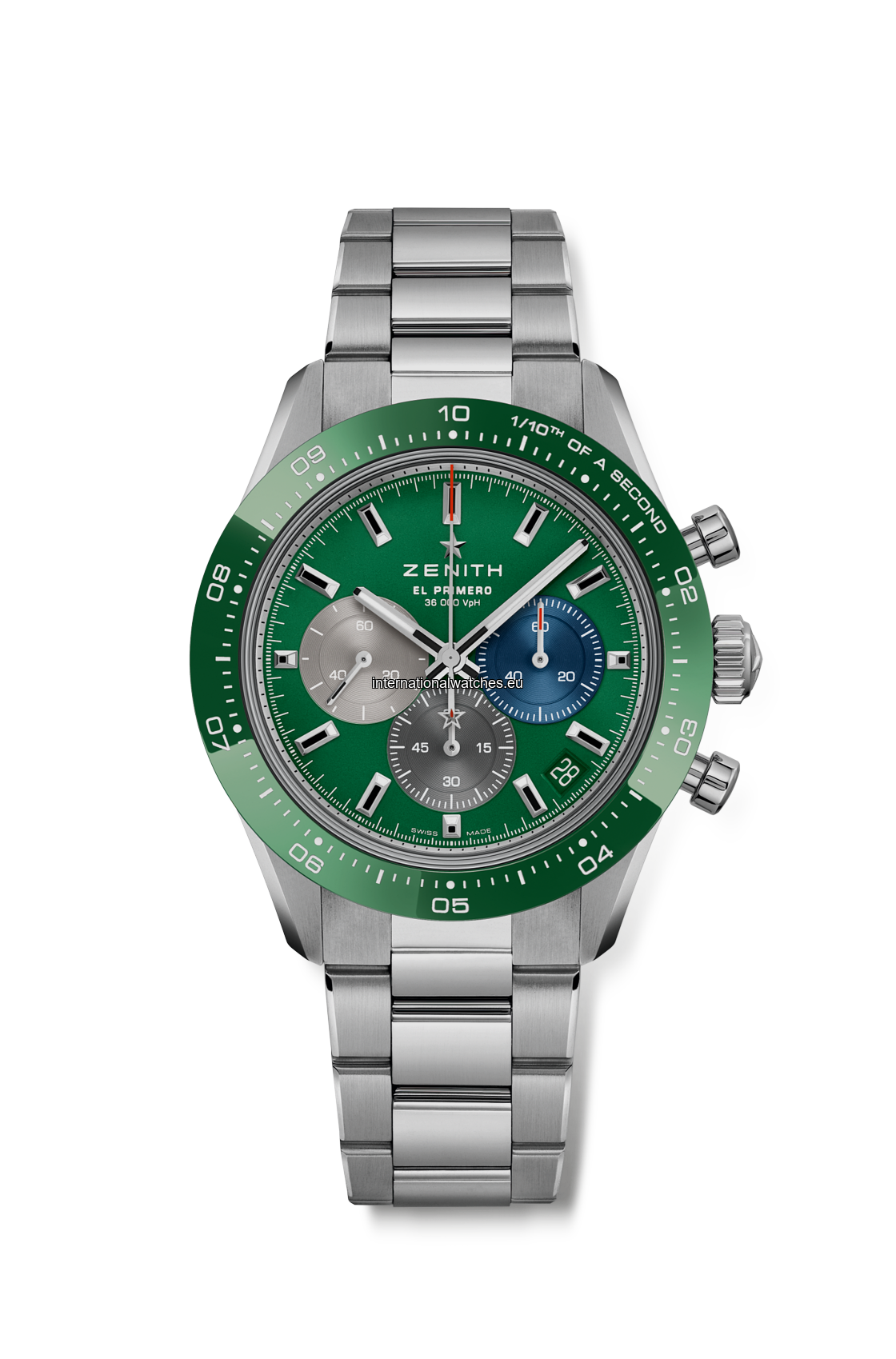 The CHRONOMASTER Sport is crafted in a 41mm steel case with a green ceramic bezel, paired with a lacquered green tricolour dial and a steel bracelet. Powered by the El Primero 3600 automatic high-frequency chronograph movement with 1/10th of a second chronograph function and a power reserve of 60 hours.