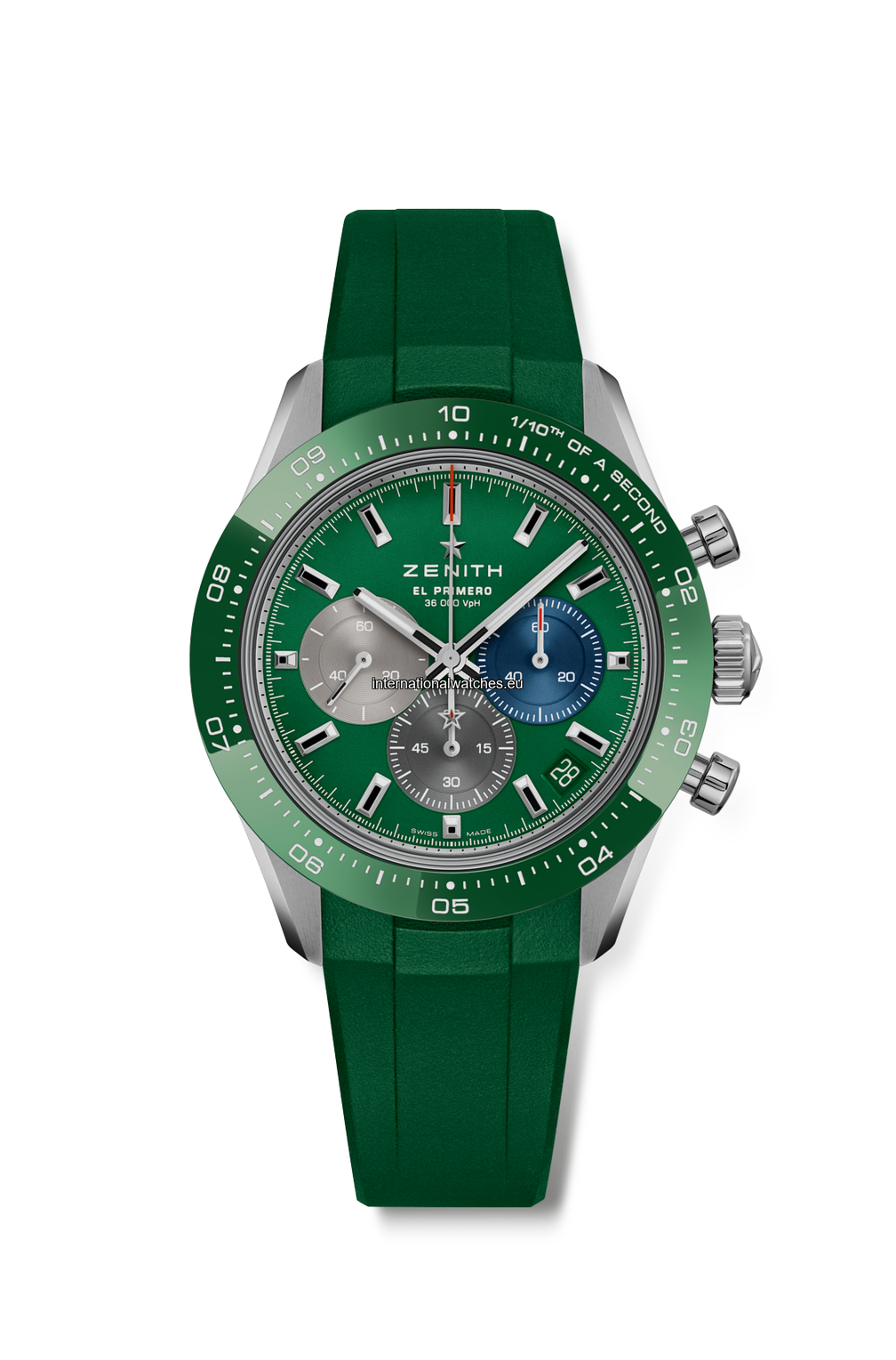 The CHRONOMASTER Sport is crafted in a 41mm steel case with a green ceramic bezel, paired with a lacquered green tricolour dial and a green rubber strap. Powered by the El Primero 3600 automatic high-frequency chronograph movement with 1/10th of a second chronograph function and a power reserve of 60 hours.