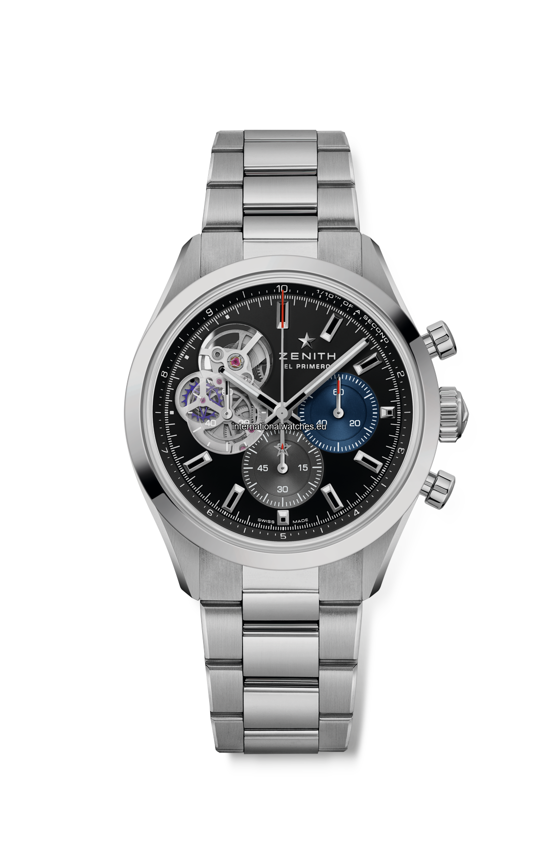 The CHRONOMASTER Open offers a view of the beating heart of the El Primero movement from the dial. Crafted in a sleek 39.5mm steel case, this version features a matte black dial with tricolour counters and a transparent counter for the running seconds, paired with an integrated steel bracelet. Powered by the El Primero 3604 1/10th of a second automatic chronograph movement.