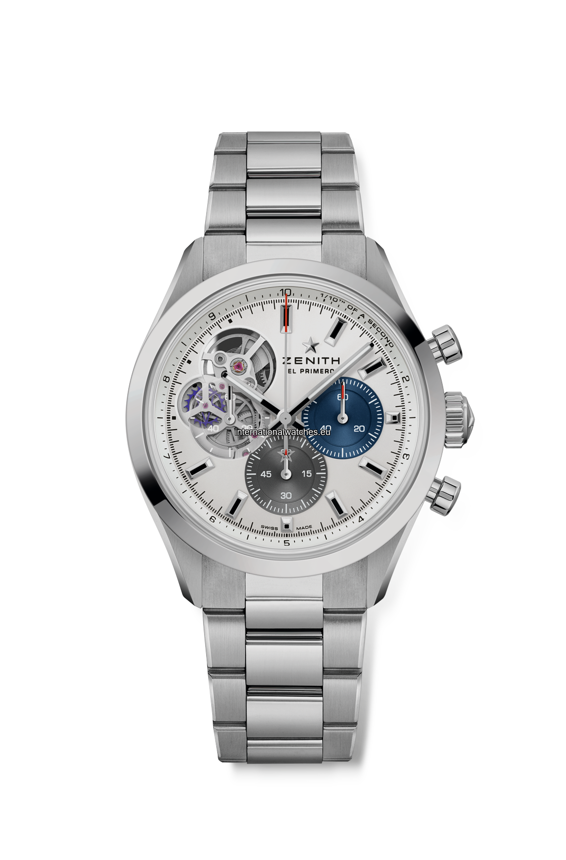 The CHRONOMASTER Open offers a view of the beating heart of the El Primero movement from the dial. Crafted in a sleek 39.5mm steel case, this version features a matte silver dial with tricolour counters and a transparent counter for the running seconds, paired with an integrated steel bracelet. Powered by the El Primero 3604 1/10th of a second automatic chronograph movement.