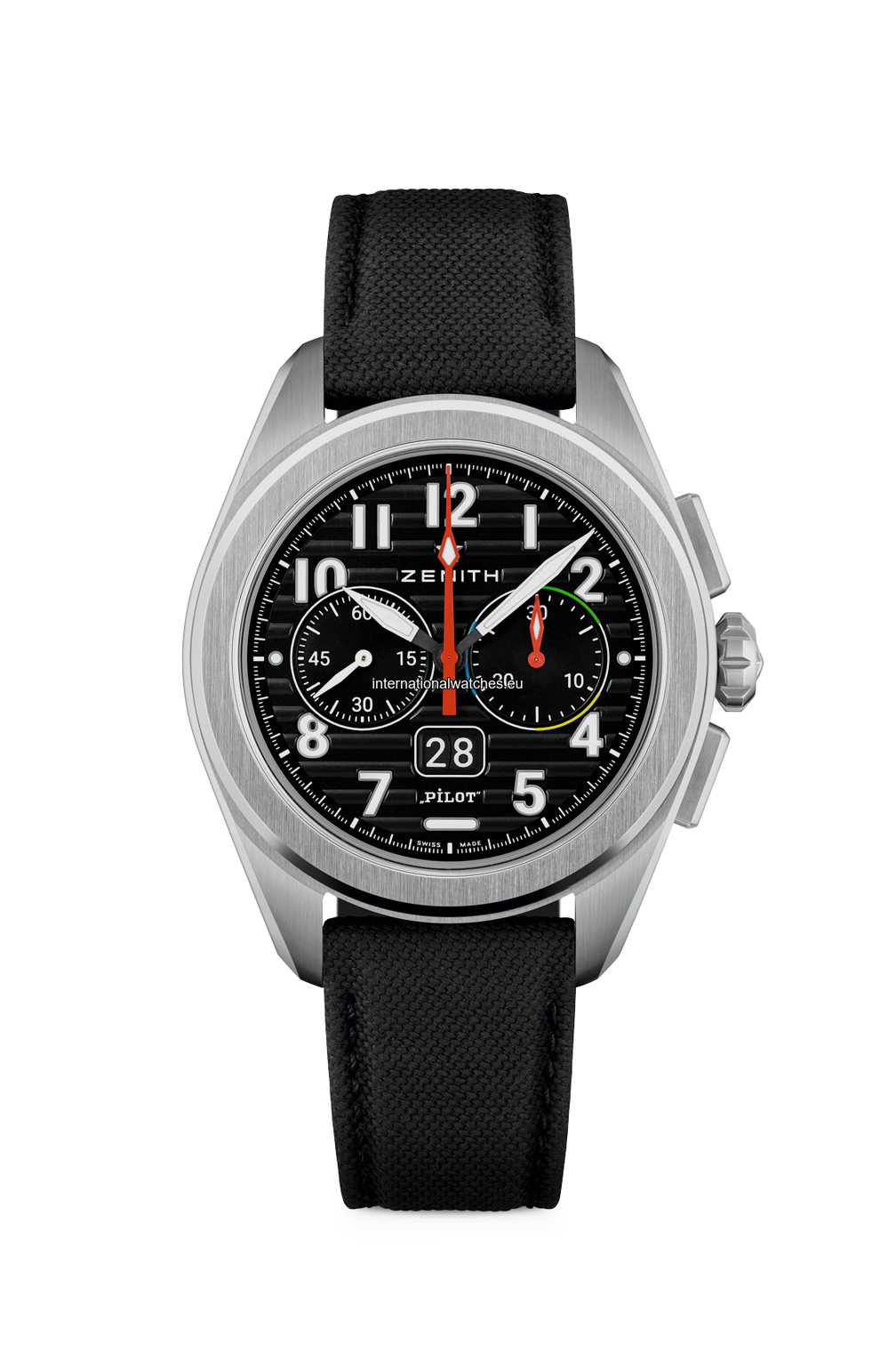 The ZENITH aviator's chronograph returns in the PILOT Big Date Flyback. Crafted in a 42.5mm steel case with an oversized crown, paired with a black corrugated dial featuring large luminescent Arabic numerals and coloured indications for easier reading. Delivered with interchangeable black cordura-effect rubber and brown calfskin leather straps. Powered by the El Primero 3652 automatic high-frequency chronograph calibre with big date and the flyback functions.