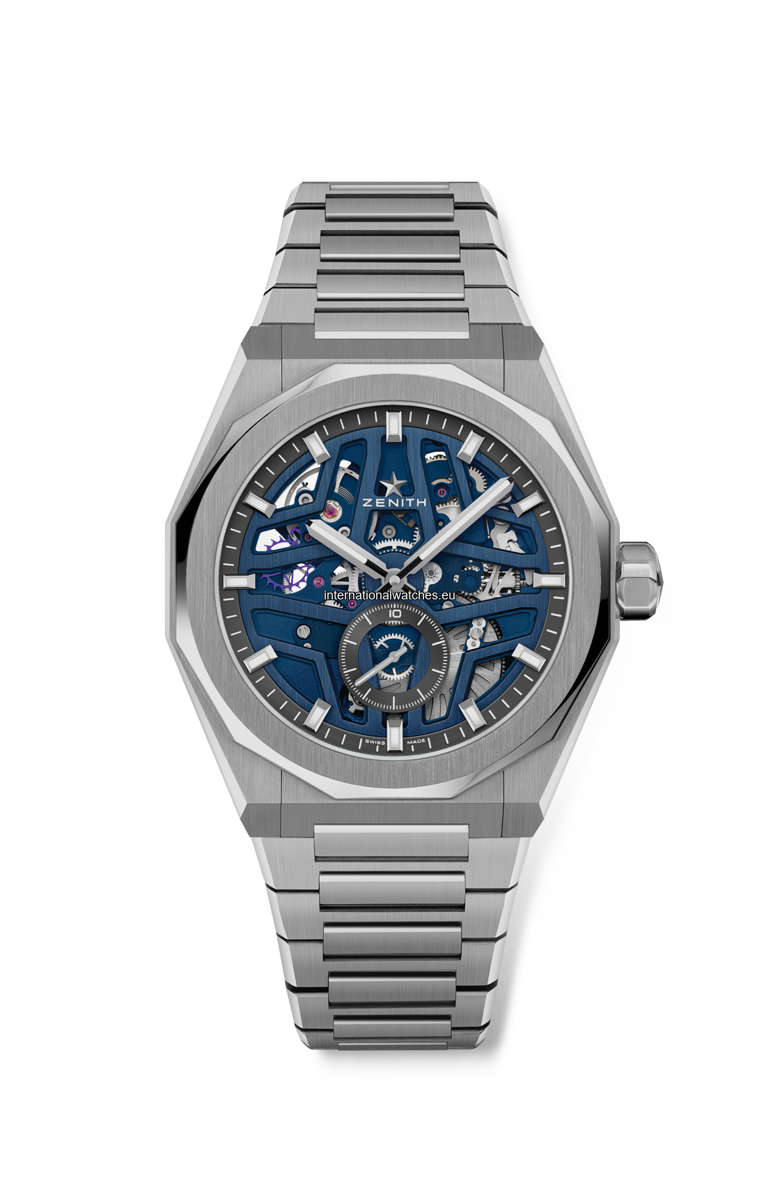 DEFY Skyline Skeleton in a 41mm steel octagonal case with a faceted bezel, featuring a blue open dial revisiting the emblematic ZENITH four-pointed star. Powered by the El Primero 3620 SK high-frequency automatic manufacture skeleton movement with the very first 1/10th of a second indicator. Interchangeable steel bracelet and blue patterned rubber strap.