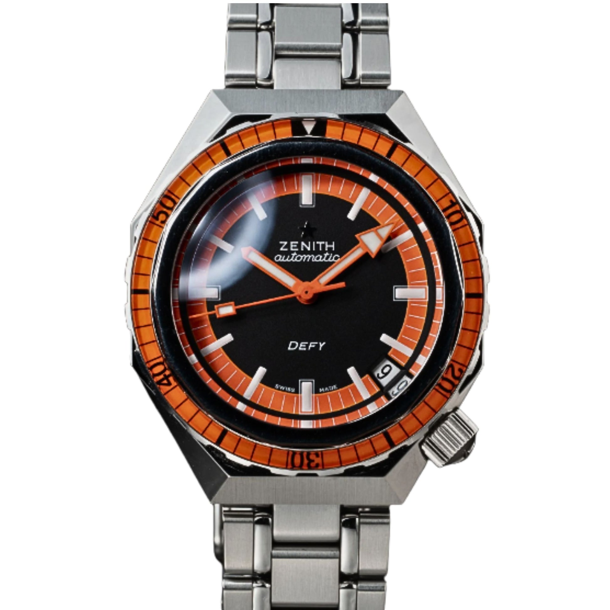 A faithful reproduction of the first DEFY diver’s watch from 1969. The DEFY Revival A3648 is crafted in a faceted 37mm steel case with a unidirectional rotating bezel in steel with orange tinted sapphire insert, with a water-resistance of 60 ATM (600 metres). Black and orange dial with luminescent hands and markers. Powered by the Elite 670 automatic manufacture movement with 50 hours power reserve. Steel bracelet with folding clasp.