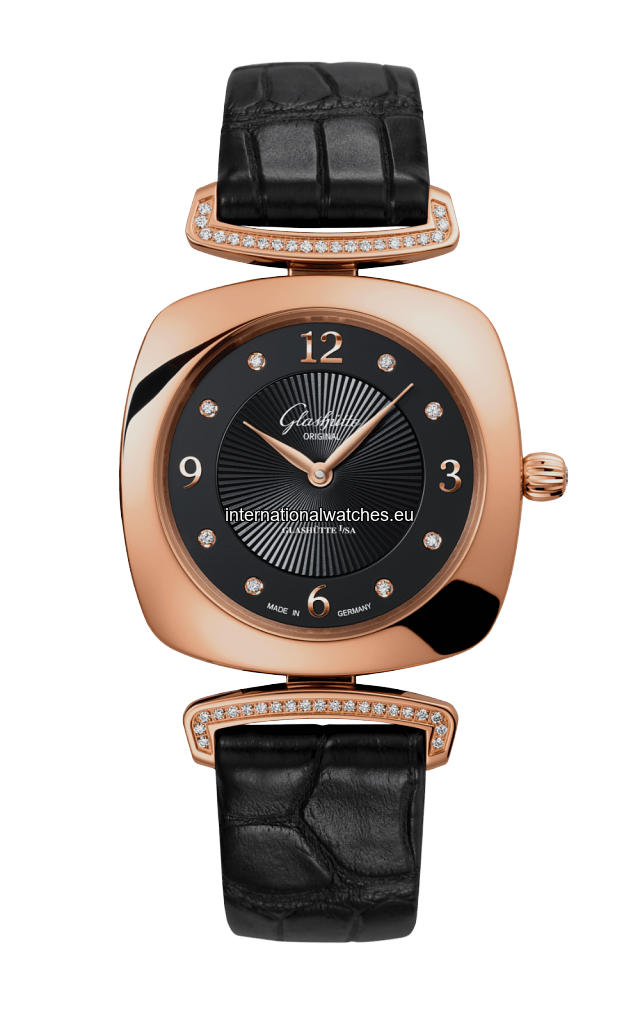Elegance in black: the Pavonina womens’ watch. With a black dial, red gold case and diamonds on crown and lugs.