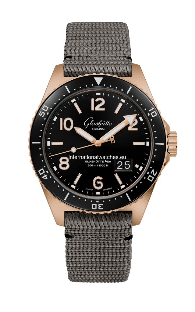The SeaQ Panorama Date in red gold with black dial. A sporty, elegant diver’s watch with 36-13 calibre. Water proof up to 30 bar. Synthetic strap grey.