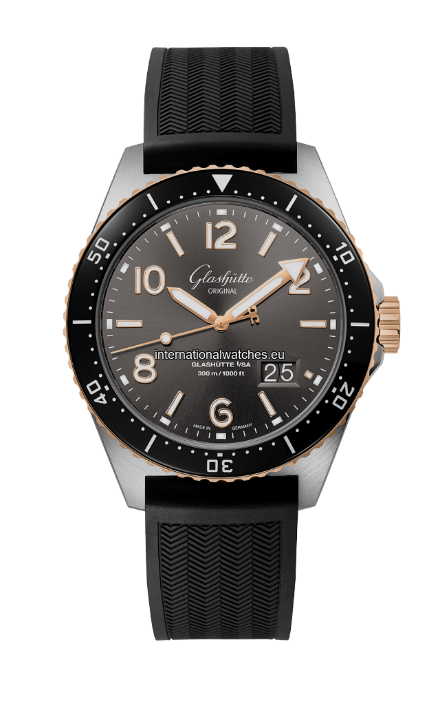 The SeaQ Panorama Date in bi-colour with grey dial: a stylish diver’s watch with water resistance up to 30 bar. Rubber strap black.