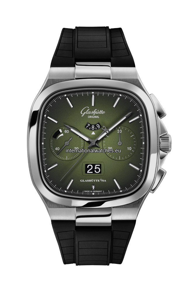 The Seventies Chronograph Panorama Date with green dial brings the 70s to your wrist. Retro-modern in stainless steel. Rubber strap in black.