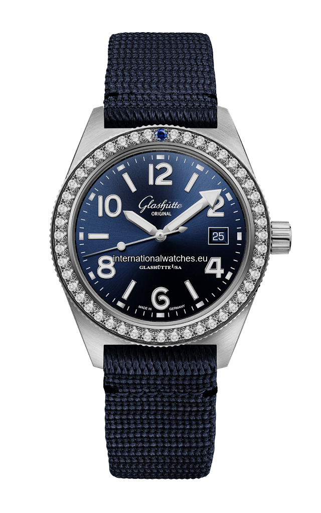 Elegant and sporty at the same time: the SeaQ with diamond bezel. Water-resistant up to 20 bar. Calibre 39-11, stainless steel case, synthetic strap.