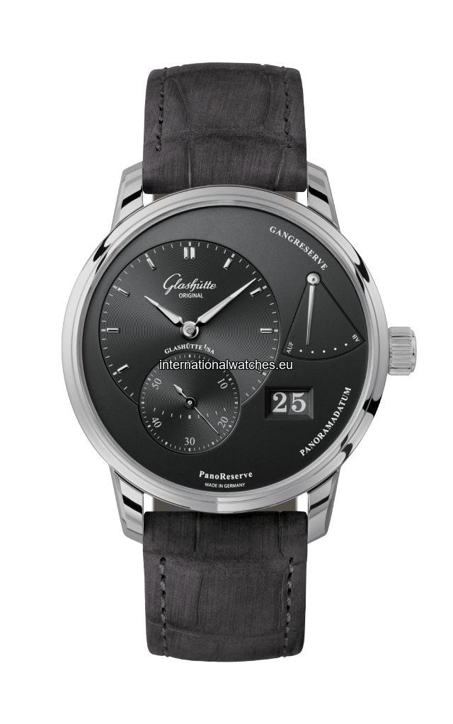 The PanoReserve offers fascinating views and perfection. Stainless steel watch with black dial, Panorama Date, power reserve display, grey leather strap.