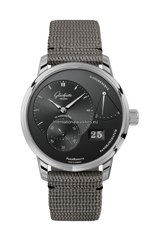 The PanoReserve offers fascinating views and perfection. Stainless steel watch with black dial, Panorama Date, power reserve display, grey synthetic strap.