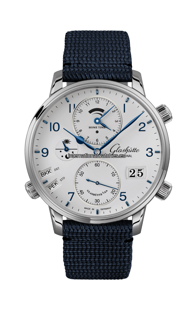 The Senator Cosmopolite: a Globetrotter watch in stainless steel. White dial, second time zone, 24 time zones (GMT), Panorama Date, blue synthetic strap.
