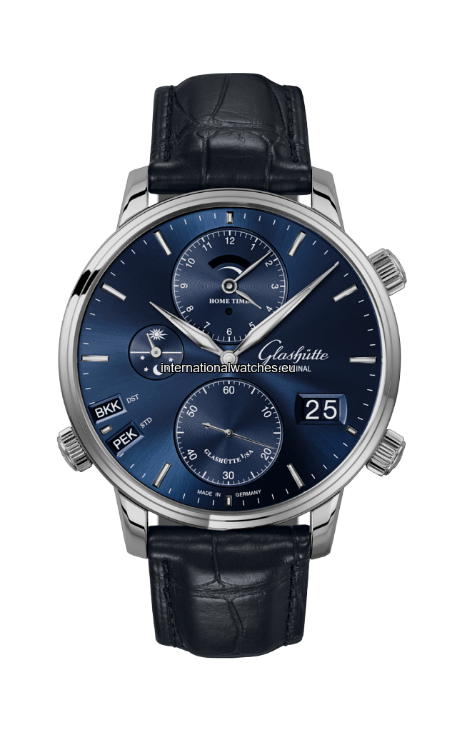 The ideal travel companion: The Senator Cosmopolite with blue dial. Stainless steel watch, second time zone, blue leather strap.