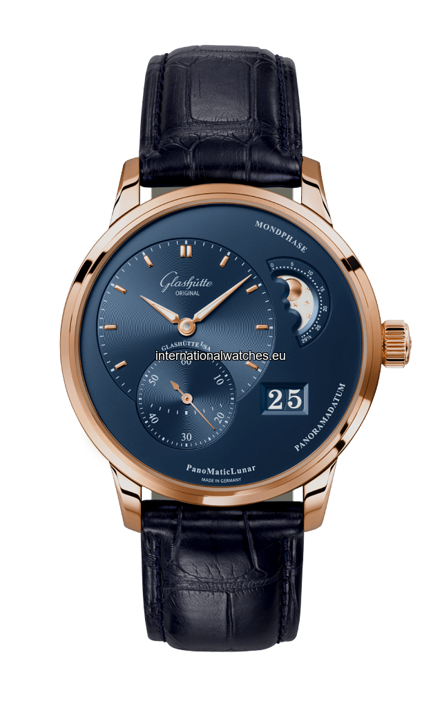 The PanoMaticLunar combines an asymmetrical design with clarity and elegance. Red gold watch with blue dial, Panorama Date, moon phase, blue leather strap.