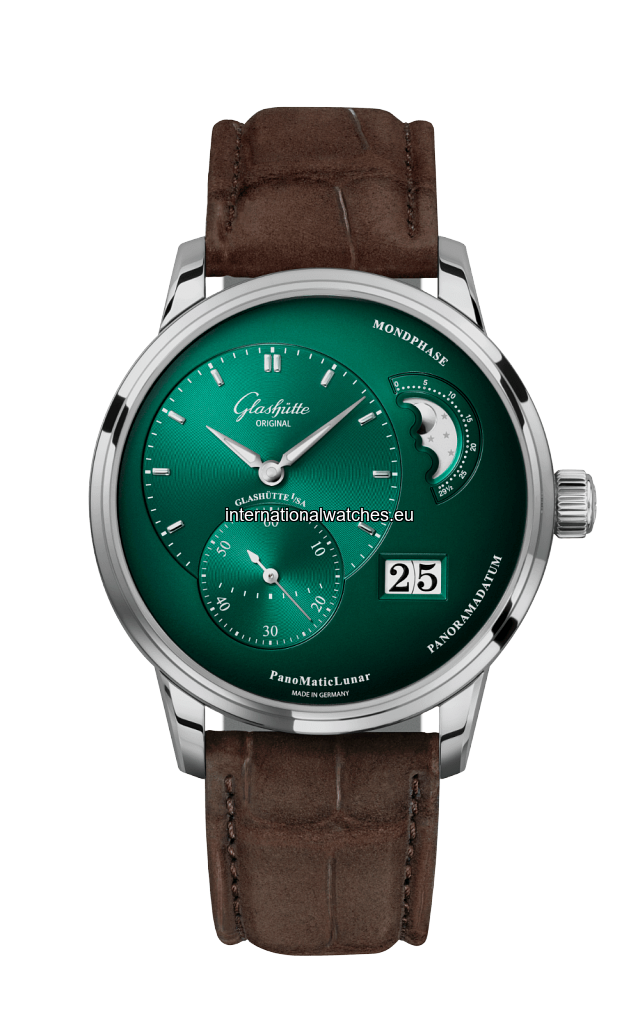 The PanoMaticLunar combines an asymmetrical design with clarity and elegance. Stainless steel, green dial, Panorama Date, moon phase, brown leather strap.
