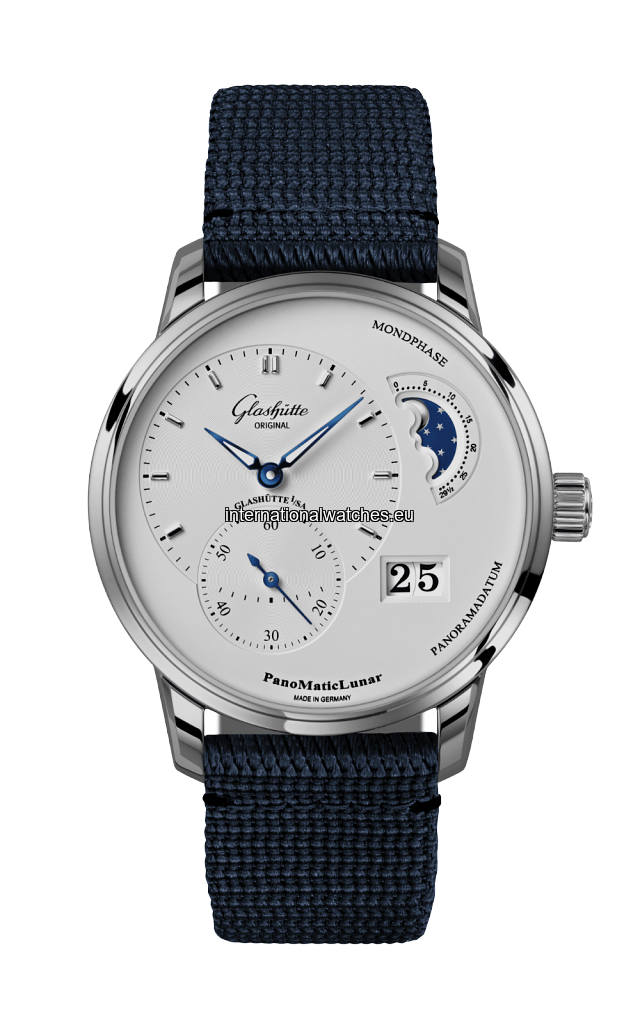 Flawless beauty with an eye-catching design: the PanoMaticLunar from Glashütte Original. Stainless steel watch, silver dial, blue synthetic strap.