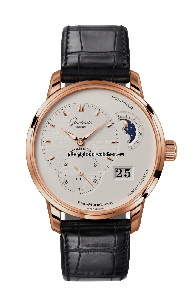 The PanoMaticLunar is a real eyecatcher, thanks to its unusual design. Red gold watch, silver dial, Panorama Date, moon phase, black leather strap.