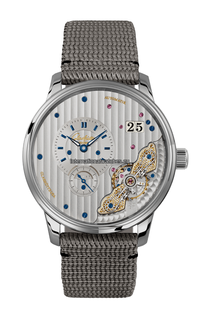 A sophisticated masterpiece with an unusual construction: The PanoMaticInverse. Stainless steel, rhodium dial, Panorama Date, grey synthetic strap.
