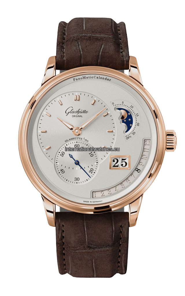 Contemporary and unmistakable: The red gold watch PanoMaticCalendar with calendar function. Silver dial, Panorama Date, Moon phase, brown leather strap.