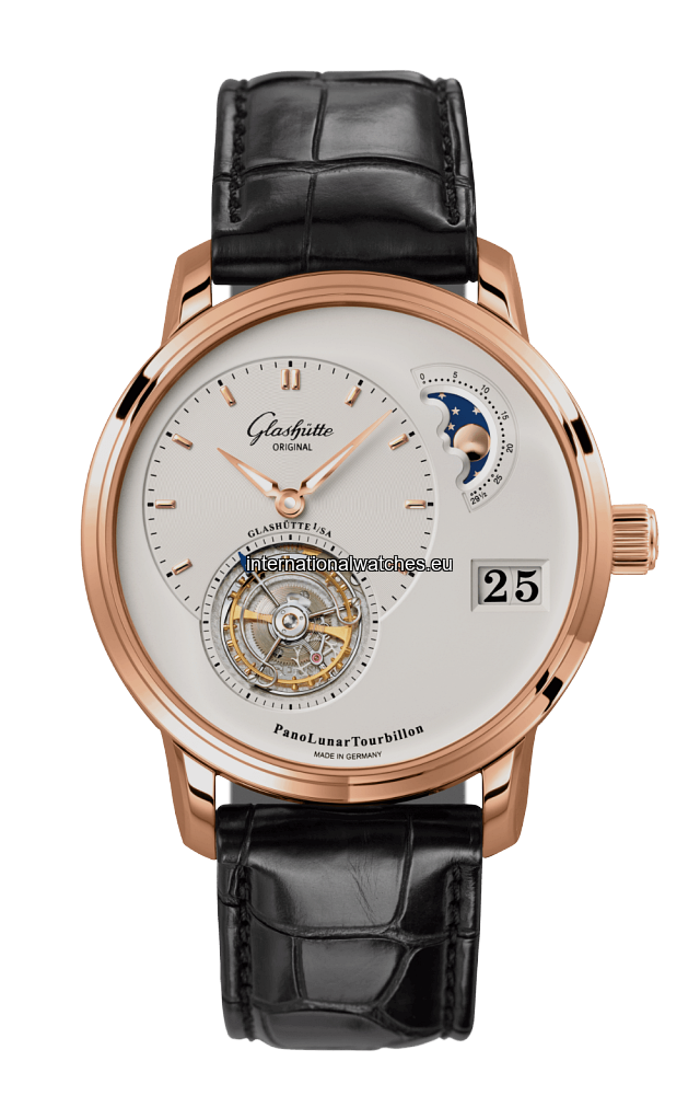 The PanoLunarTourbillon with an exquisite Flying Tourbillon. Red gold watch with silver dial, Panorama Date, moon phase, black leather strap.