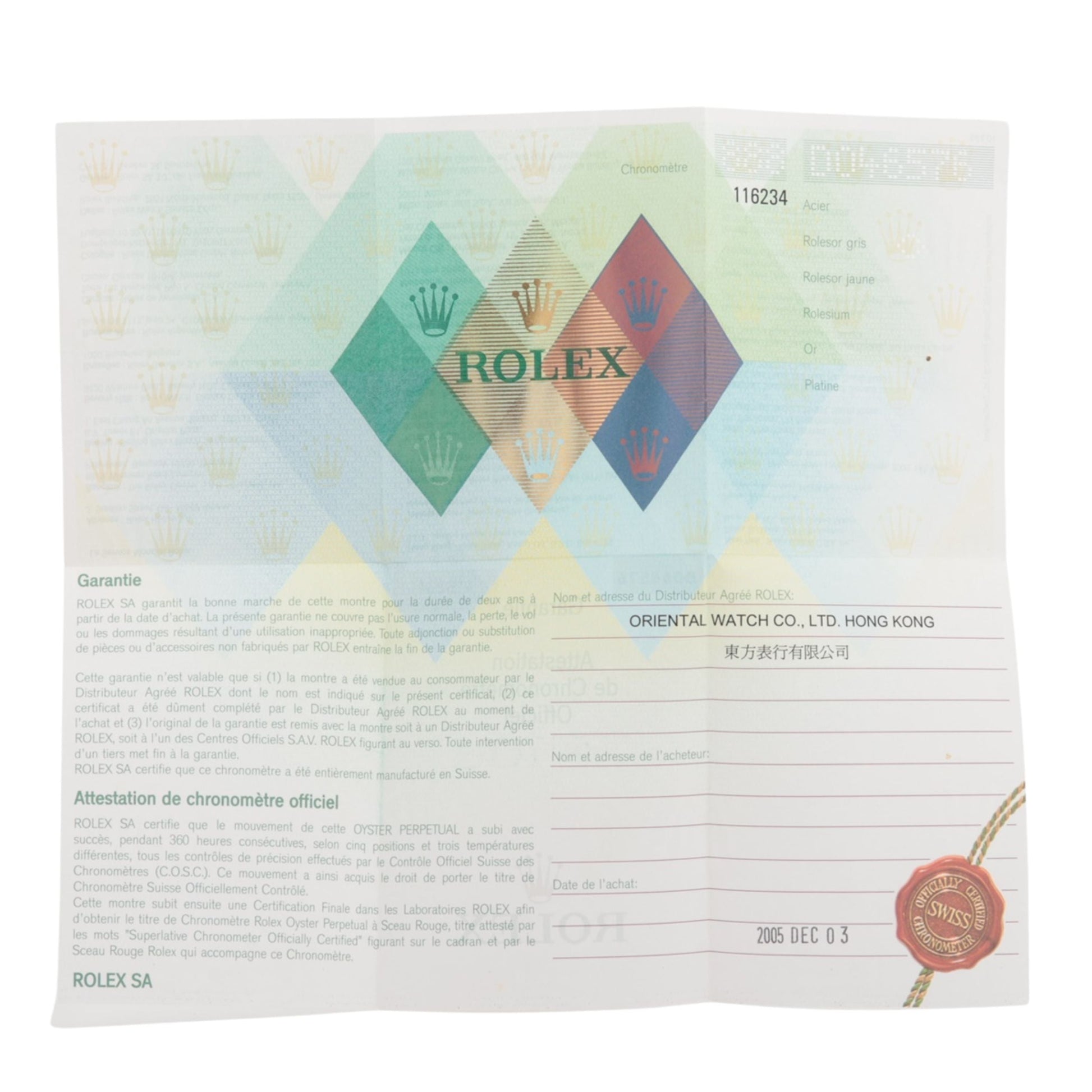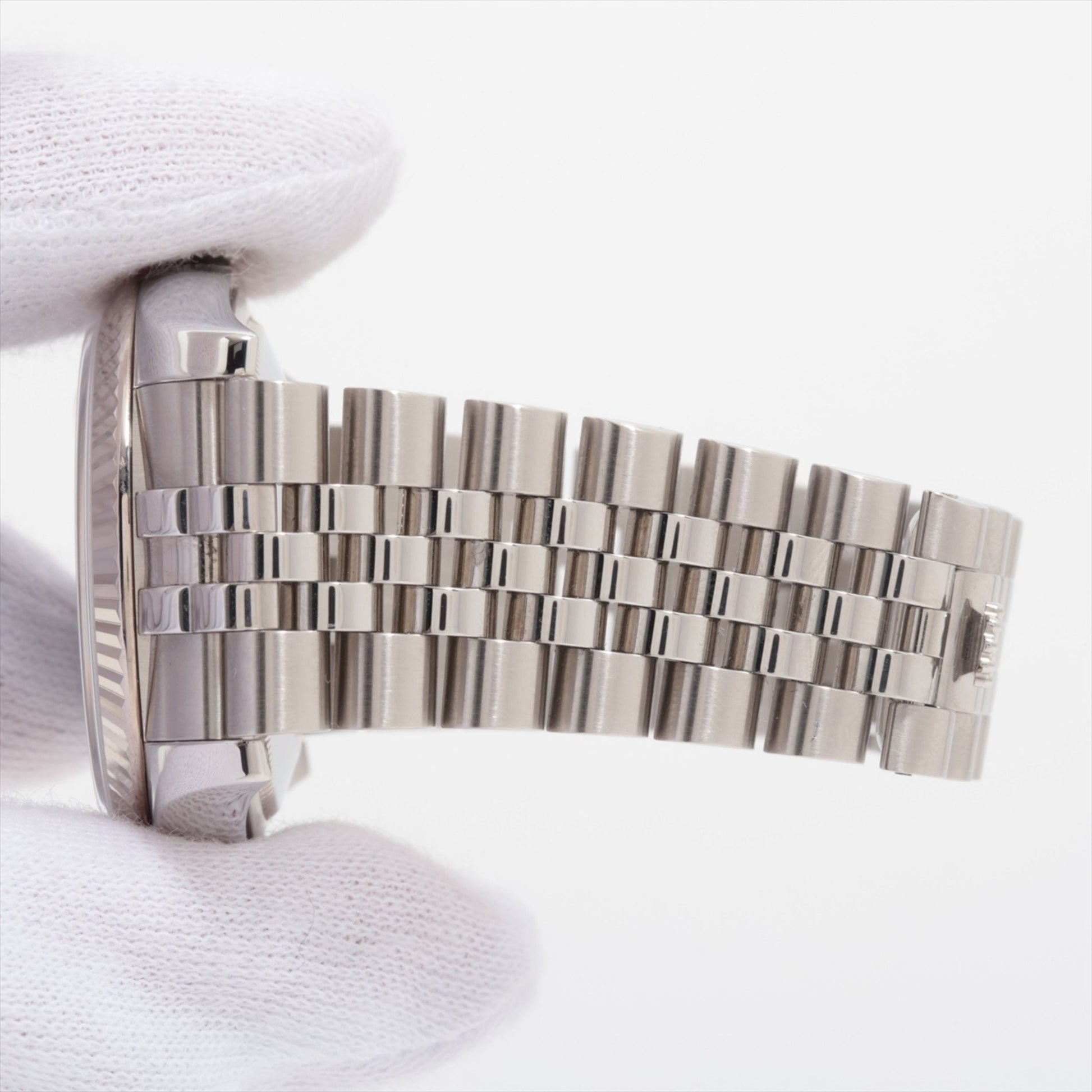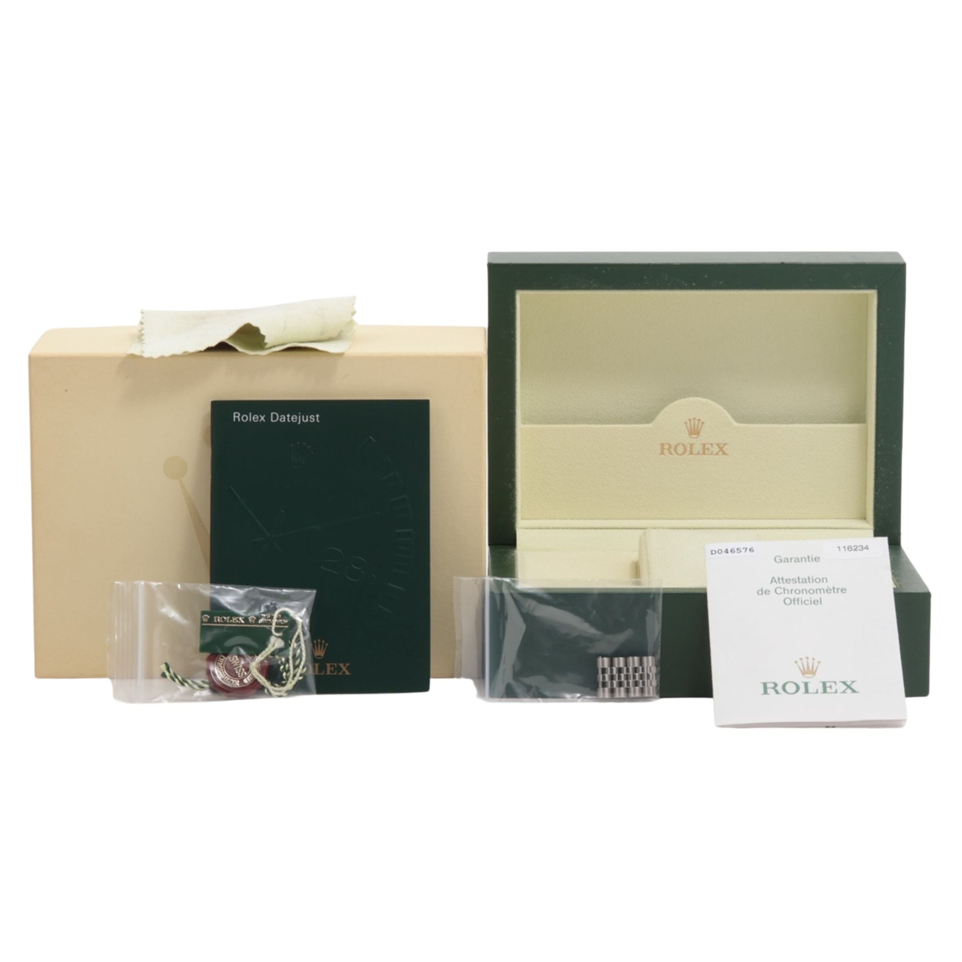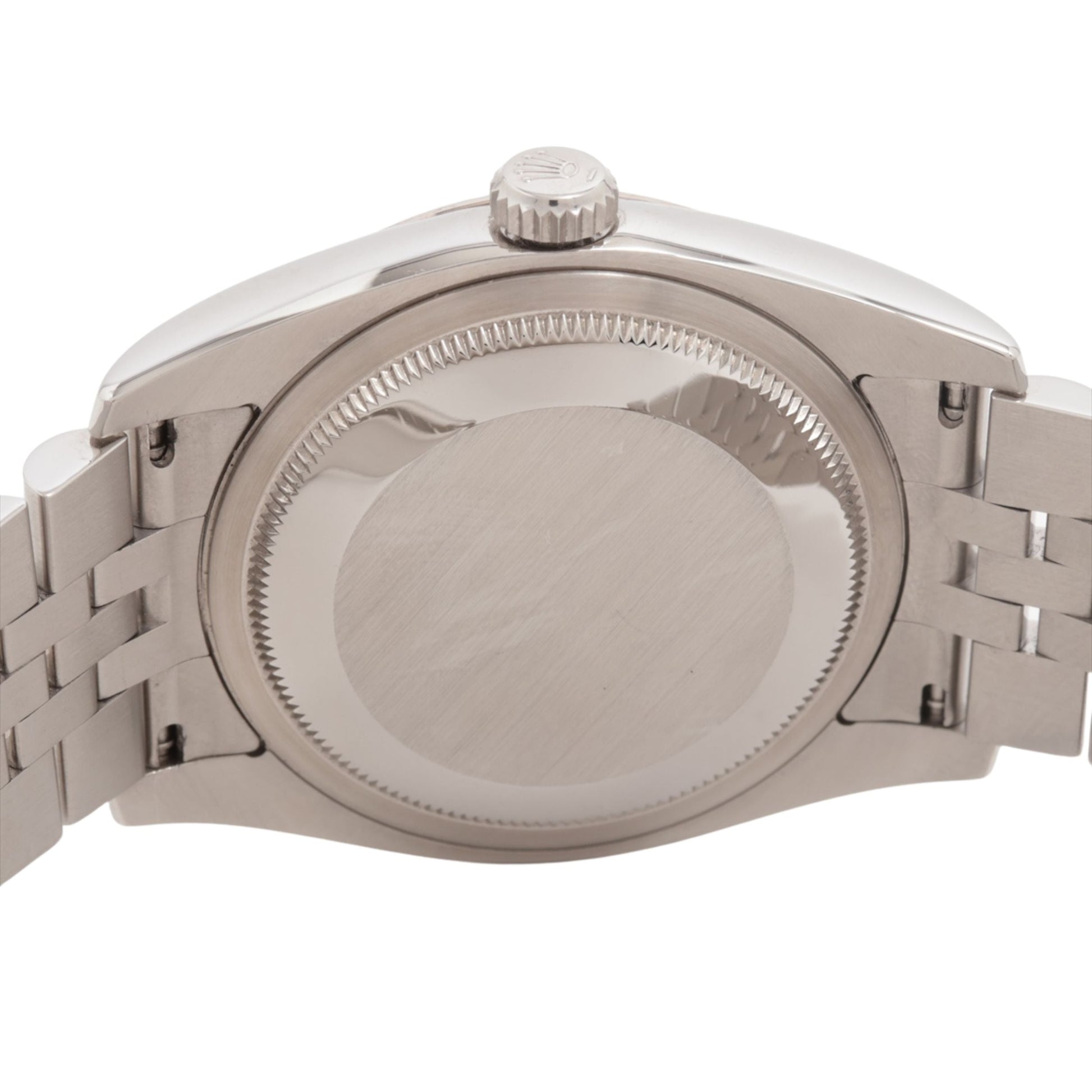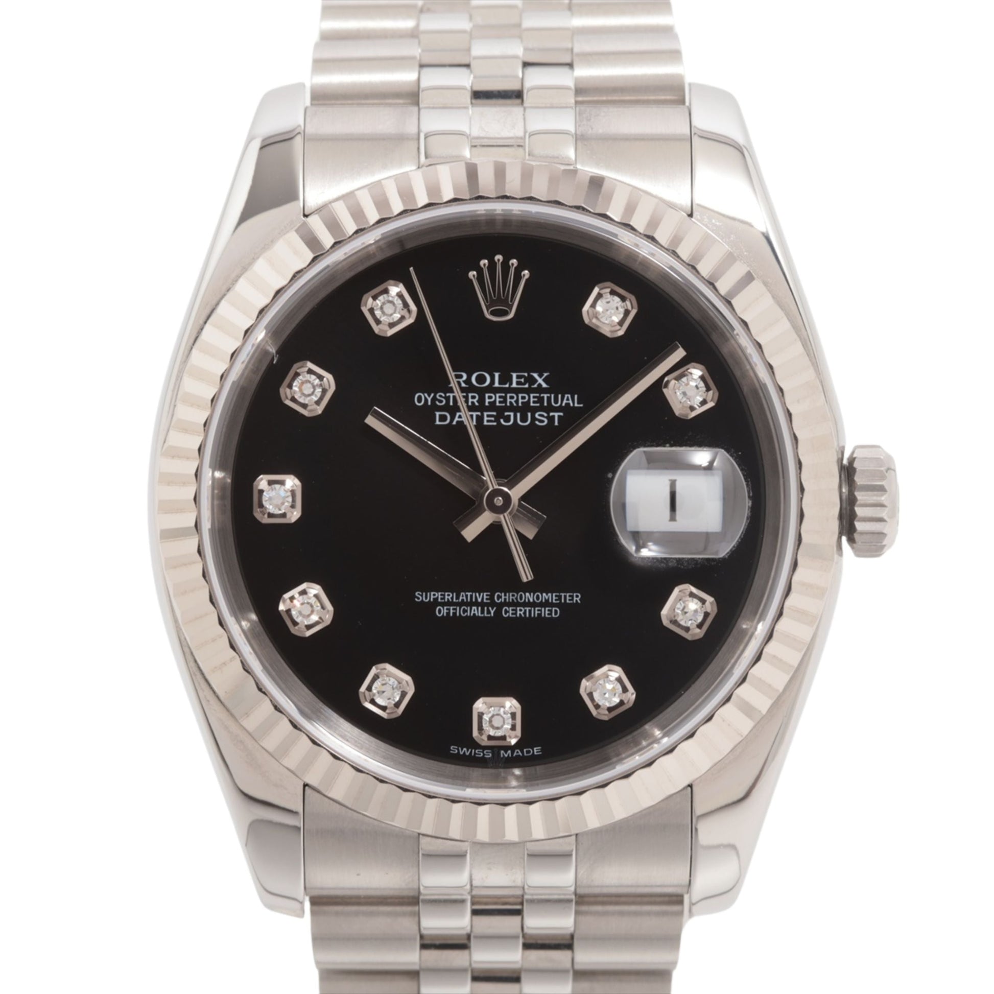 This Datejust has a stainless steel case with a stainless steel Rolex Jubilee bracelet. Black dial Index and diamonds hour markers. Scratch resistant sapphire crystal. Luminescent hands. Date display at the 3 o'clock position. Rolex Calibre 3135 Automatic movement has a 50h power reserve.[SN/D046***]
