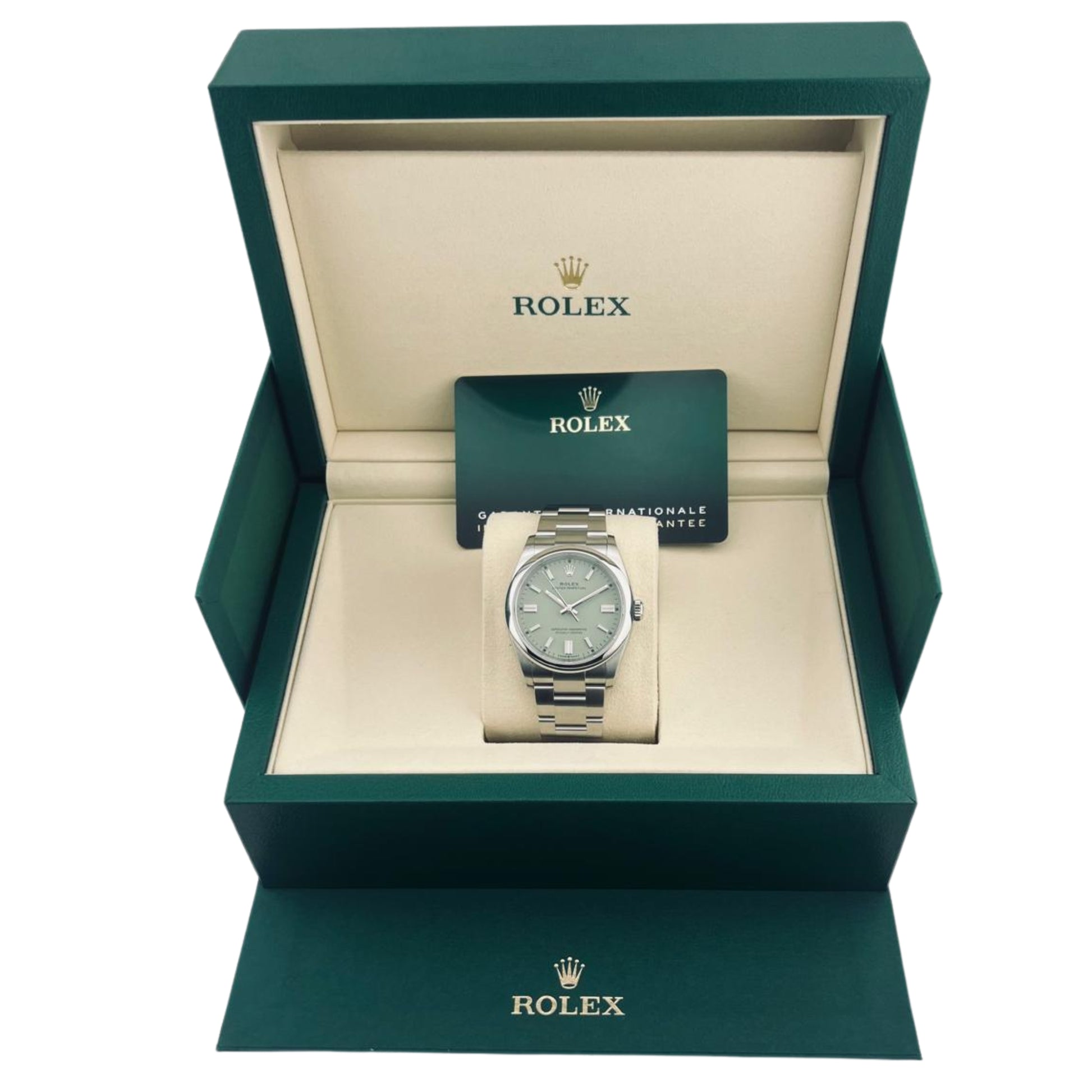 Dial: The pistachio-green dial is achieved through a refined six-layer lacquer process, creating a vibrant, glossy finish. It’s completed with hand-applied hour markers and the Rolex crown.