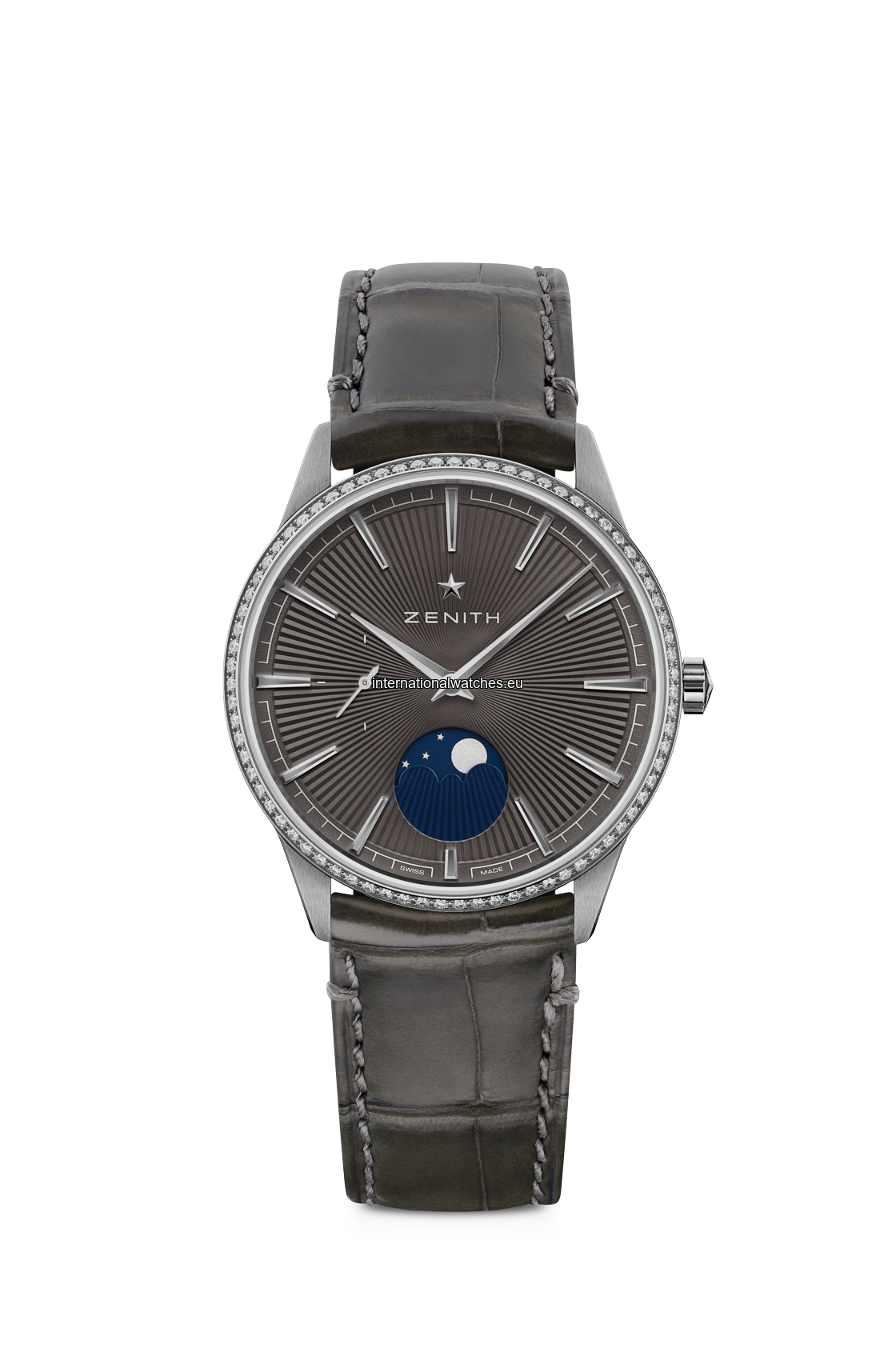The ELITE Moonphase watch is made in a 36mm steel case with diamond-set bezel and grey sunray-patterned dial, fitted on a grey alligator leather strap. Ultra-thin in its proportions and irreproachable in its performance, the ELITE manufacture calibre provides a power reserve of 50 hours with its automatic winding mechanism.
