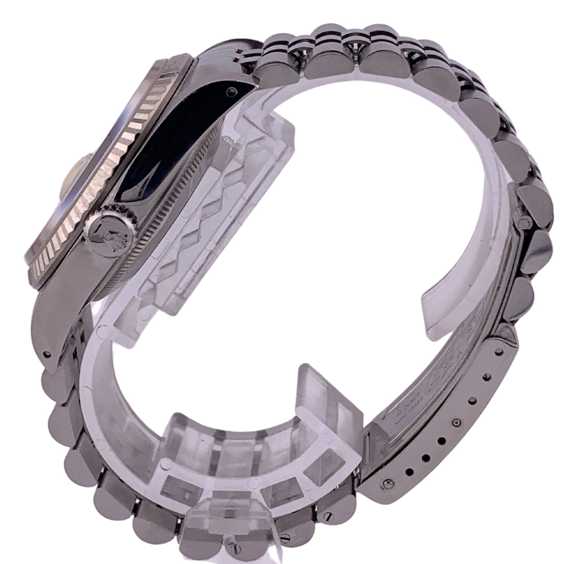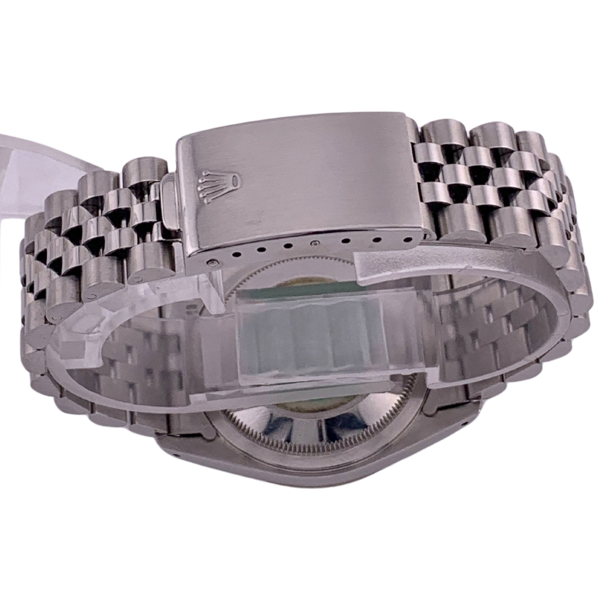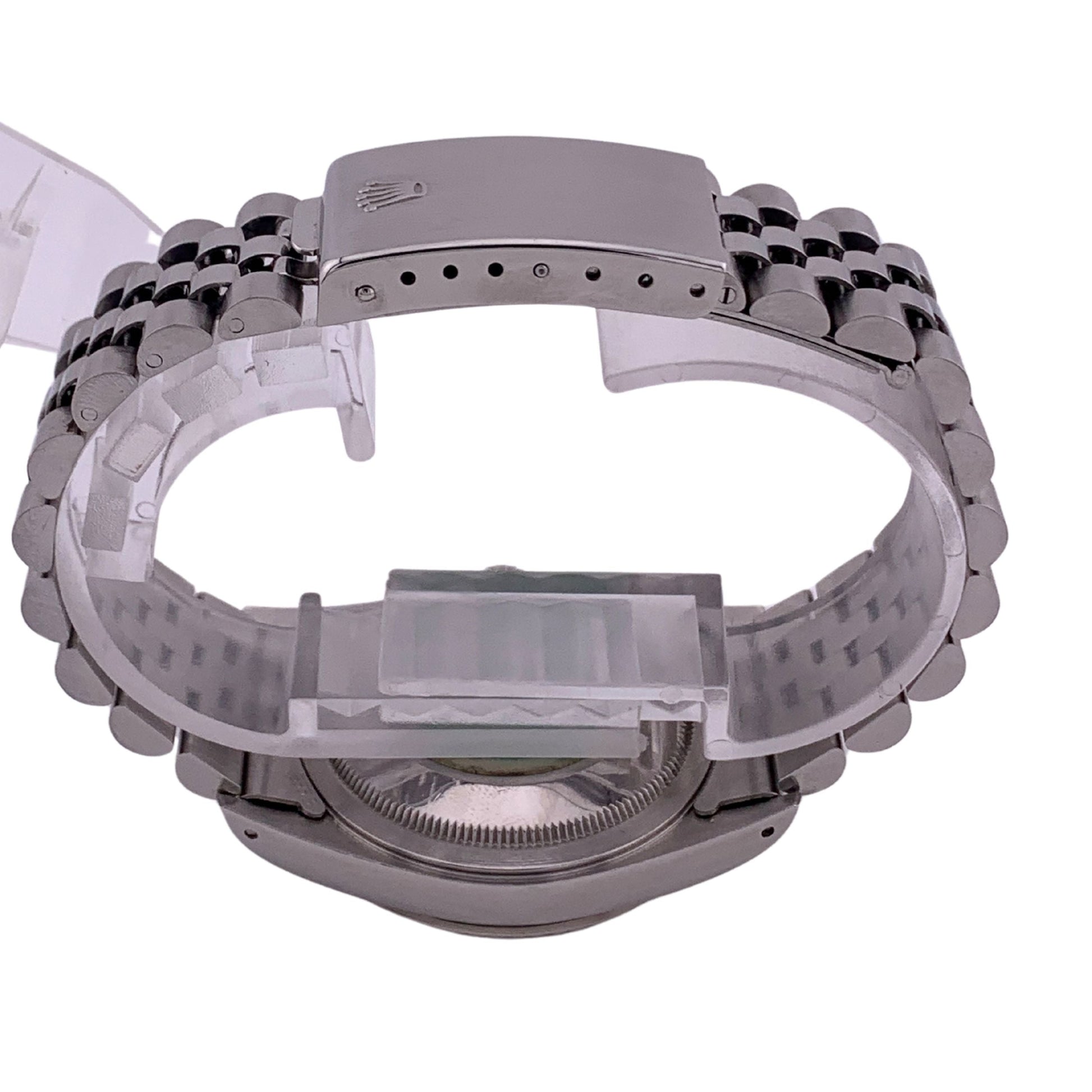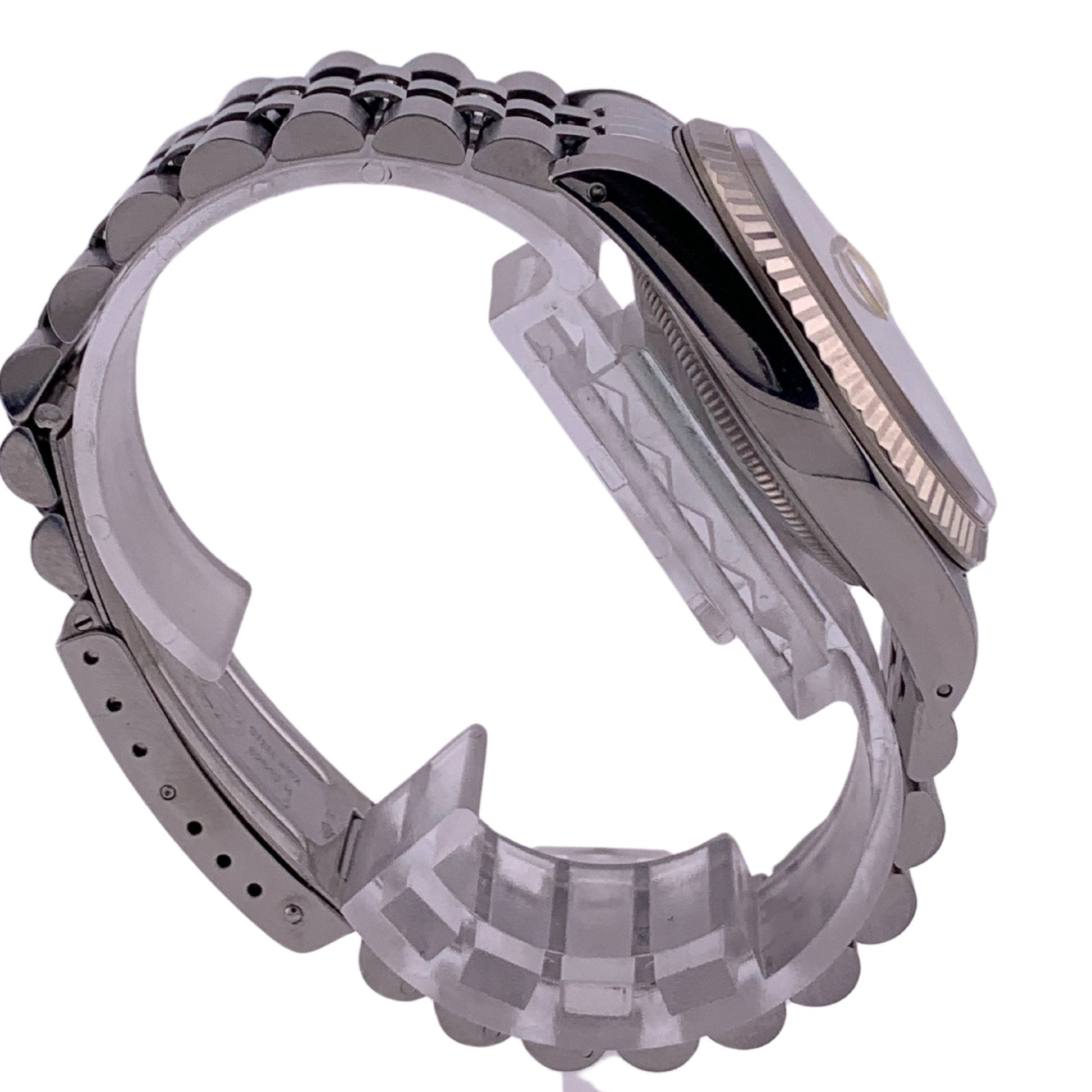 The midsize Rolex Datejust 36 16234 collection of watches for men and women feature a solid 18k white gold fluted bezel set on an oystersteel stainless steel case with the option of the Rolex oyster bracelet or jubilee bracelet. The case houses the COSC Superlative Chronometer Certified Rolex Caliber 3135 self-winding automatic movement. Like all other Rolex Datejust watches, this collection features the instantaneous date setting feature and stop-seconds feature for precise time setting. Ref.16234 [SN/X57****]