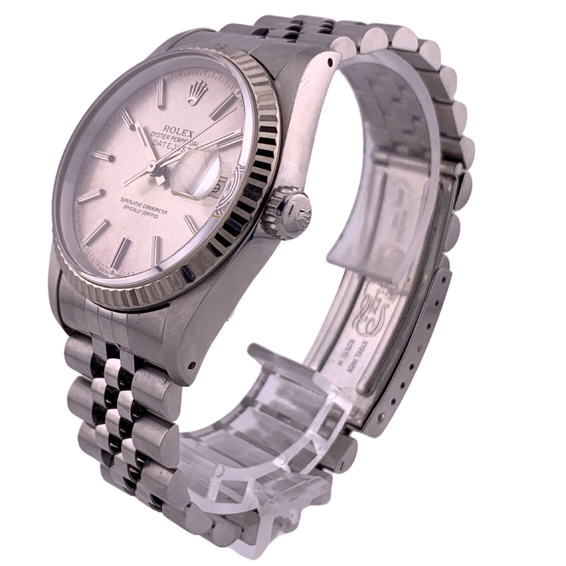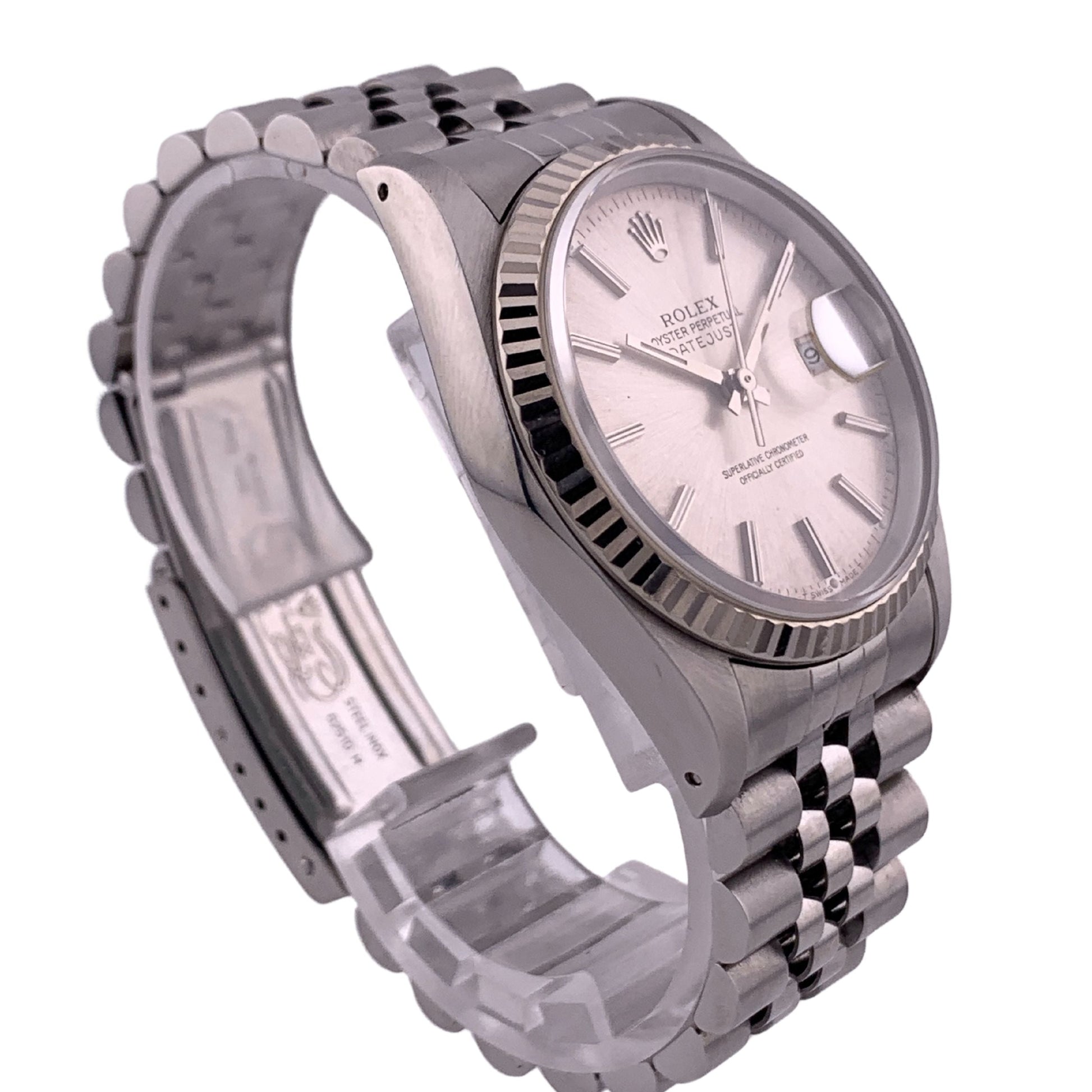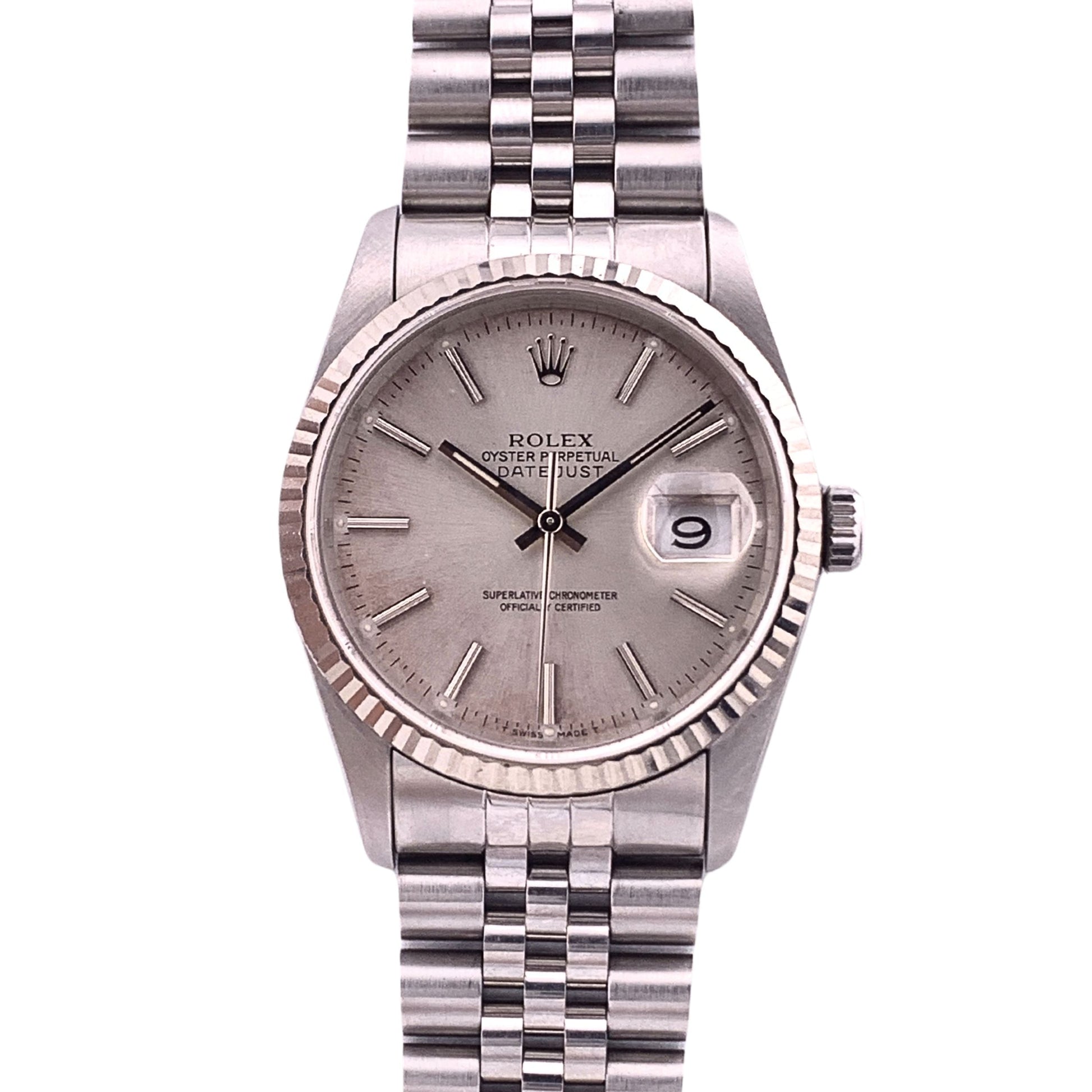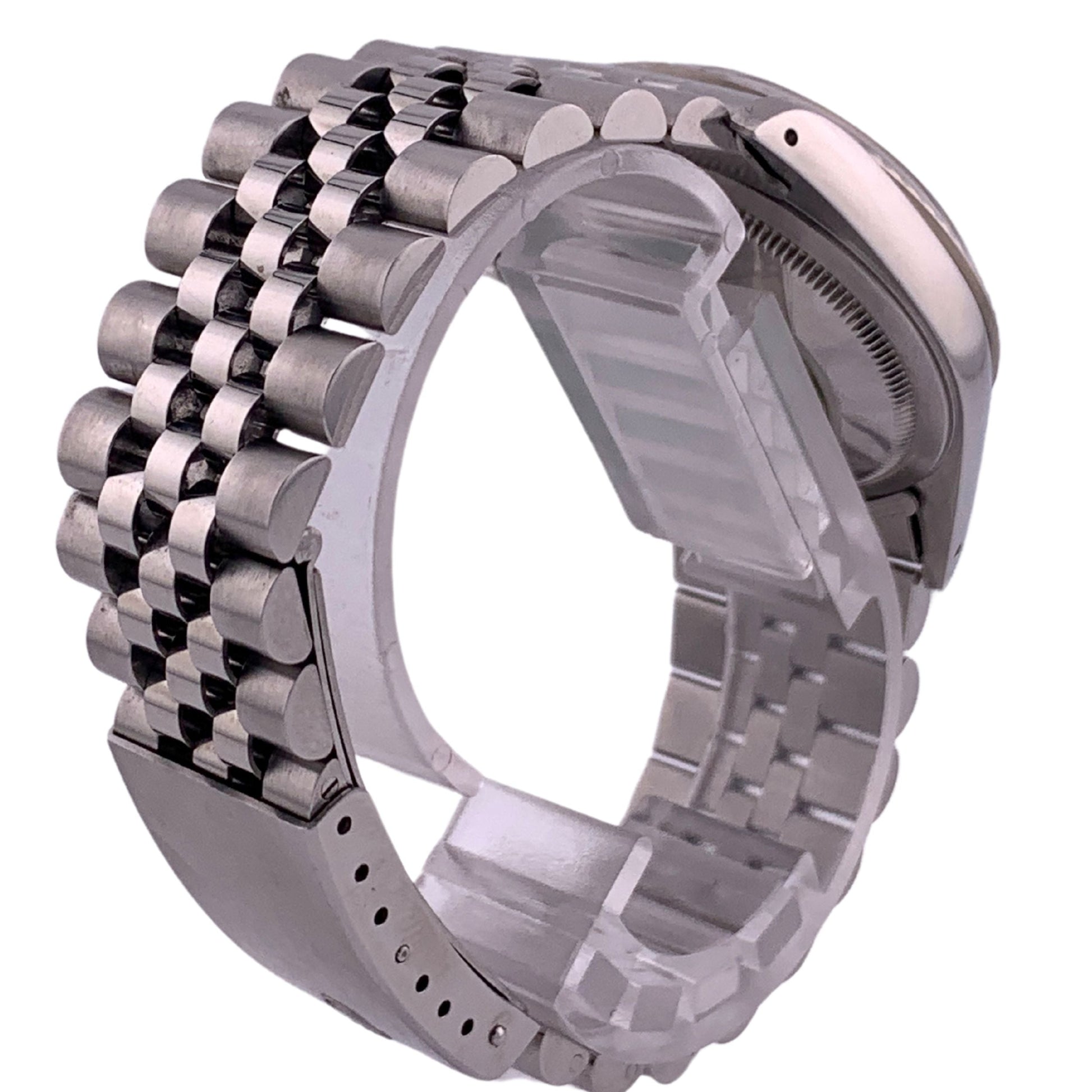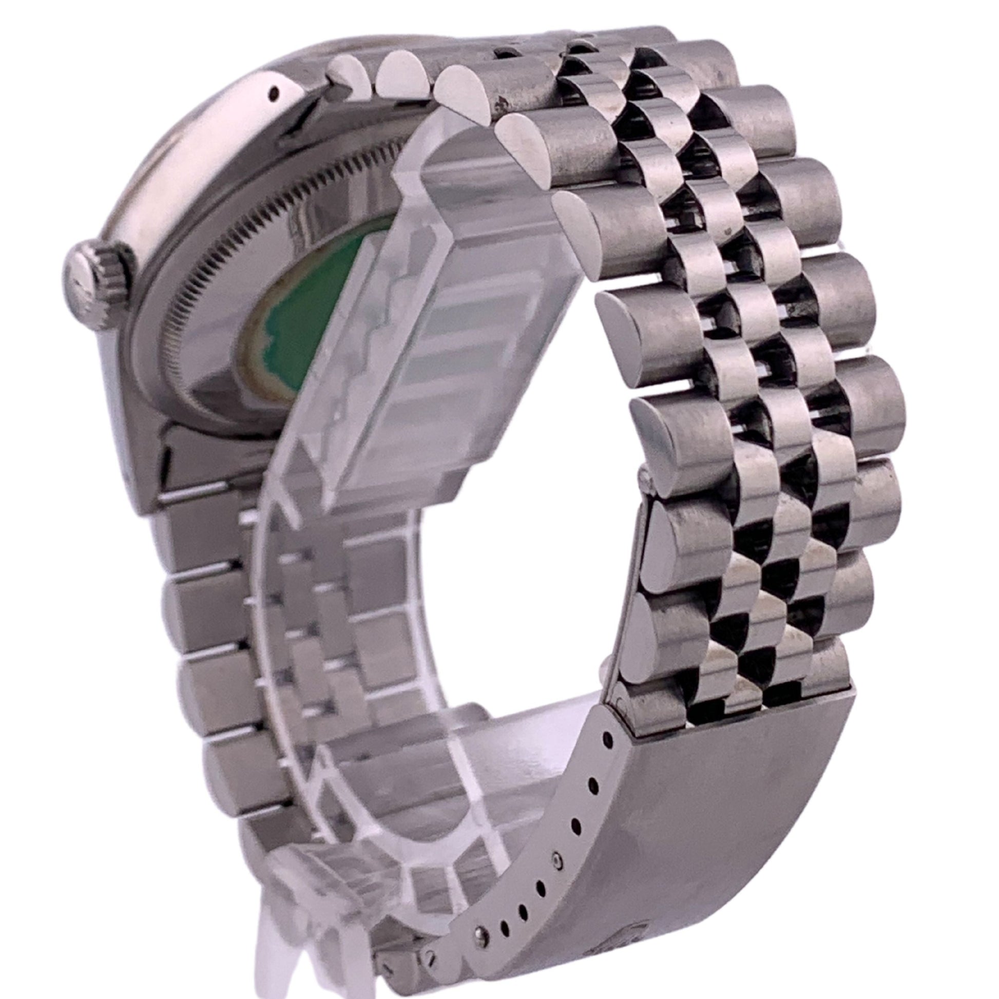 The midsize Rolex Datejust 36 16234 collection of watches for men and women feature a solid 18k white gold fluted bezel set on an oystersteel stainless steel case with the option of the Rolex oyster bracelet or jubilee bracelet. The case houses the COSC Superlative Chronometer Certified Rolex Caliber 3135 self-winding automatic movement. Like all other Rolex Datejust watches, this collection features the instantaneous date setting feature and stop-seconds feature for precise time setting. Ref.16234 [SN/X57****]