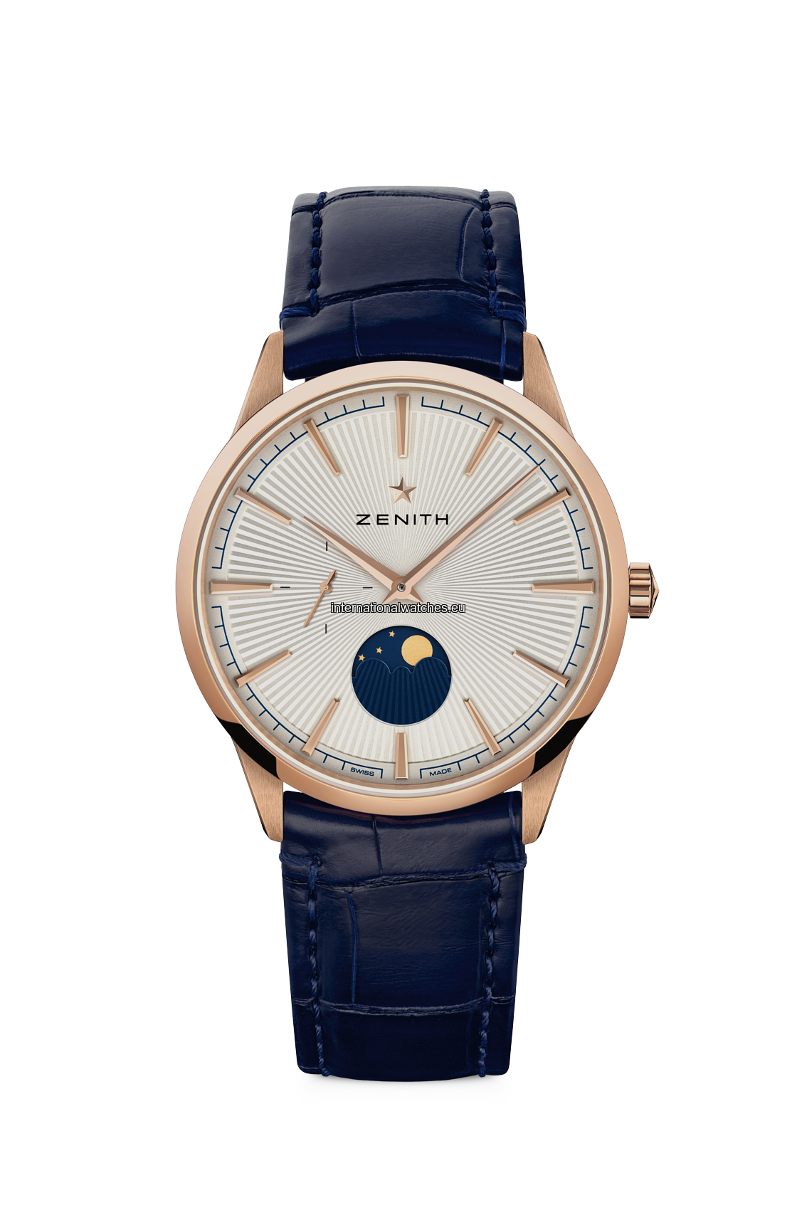 The ELITE Moonphase watch is made in 40.5mm 18k rose gold case with a silver sunray-patterned dial, fitted on a blue alligator leather strap. Ultra-thin in its proportions and irreproachable in its performance, the ELITE manufacture calibre provides a power reserve of 50 hours with its automatic winding mechanism.