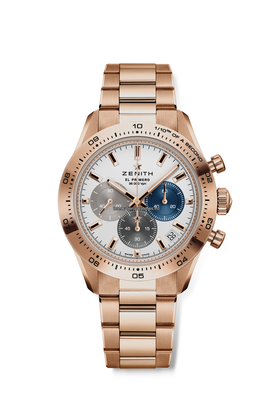 The CHRONOMASTER Sport in rose gold combines elements of past ZENITH chronograph references such as the white tricolour dial, pump-style pushers and gold bracelet in a modern 41mm steel case. Powered by the El Primero 3600 1/10th of a second automatic chronograph movement.