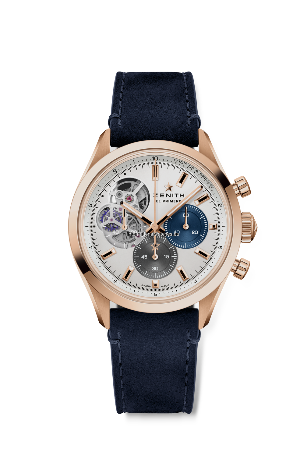 The CHRONOMASTER Open offers a view of the beating heart of the El Primero movement from the dial. Crafted in a sleek 39.5mm 18K rose gold case, this version features a matte silver dial with tricolour counters and a transparent counter for the running seconds, paired with a blue calfskin leather strap. Powered by the El Primero 3604 1/10th of a second automatic chronograph movement.