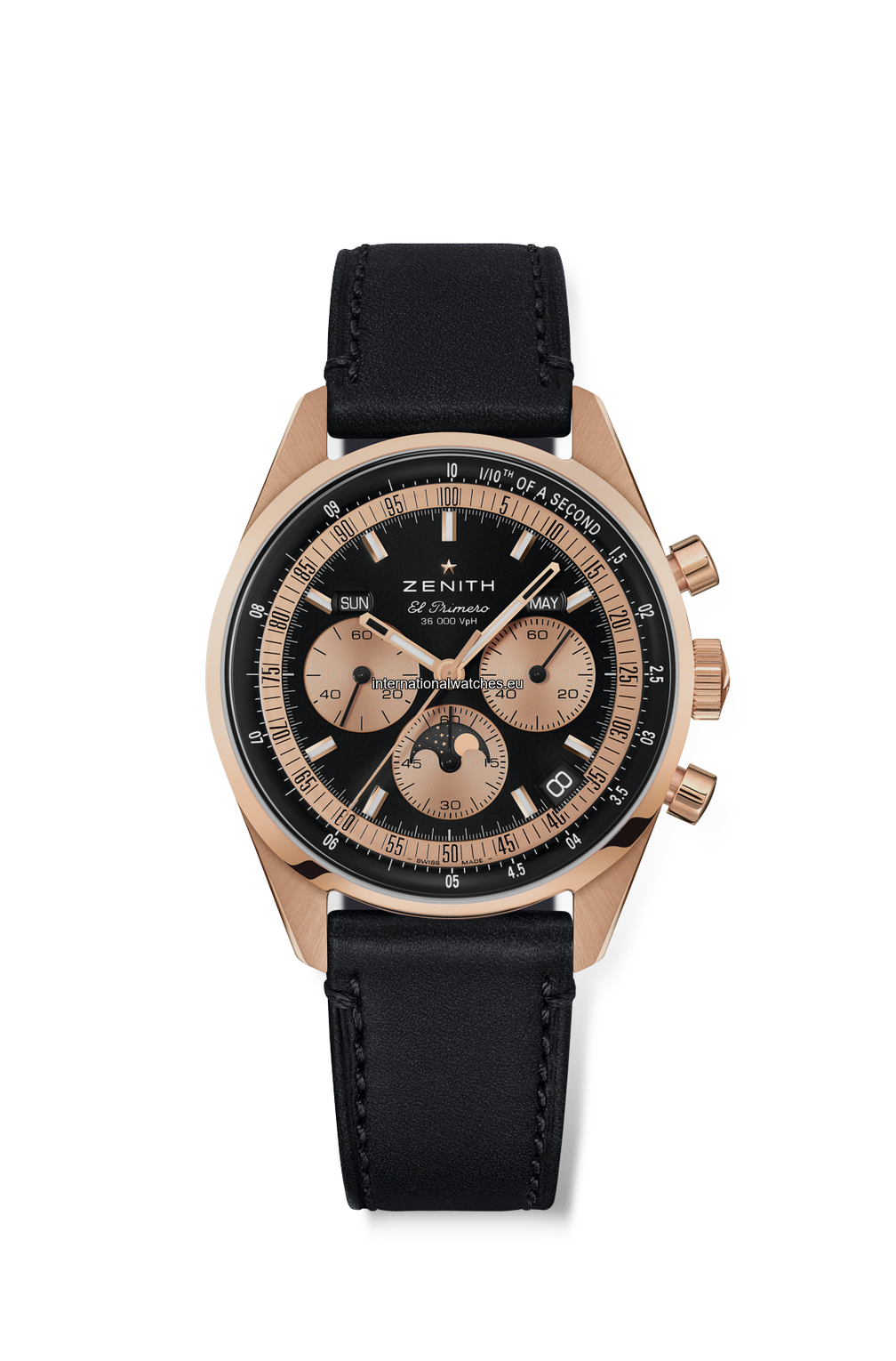 The CHRONOMASTER Original Triple Calendar is crafted in a 38mm rose gold case with a black calfskin strap and an elegant black dial with rose gold-plated counters. Powered by the El Primero 3610 automatic high-frequency movement with 1/10th of a second chronograph function combined with day, date, month and moonphase indications.