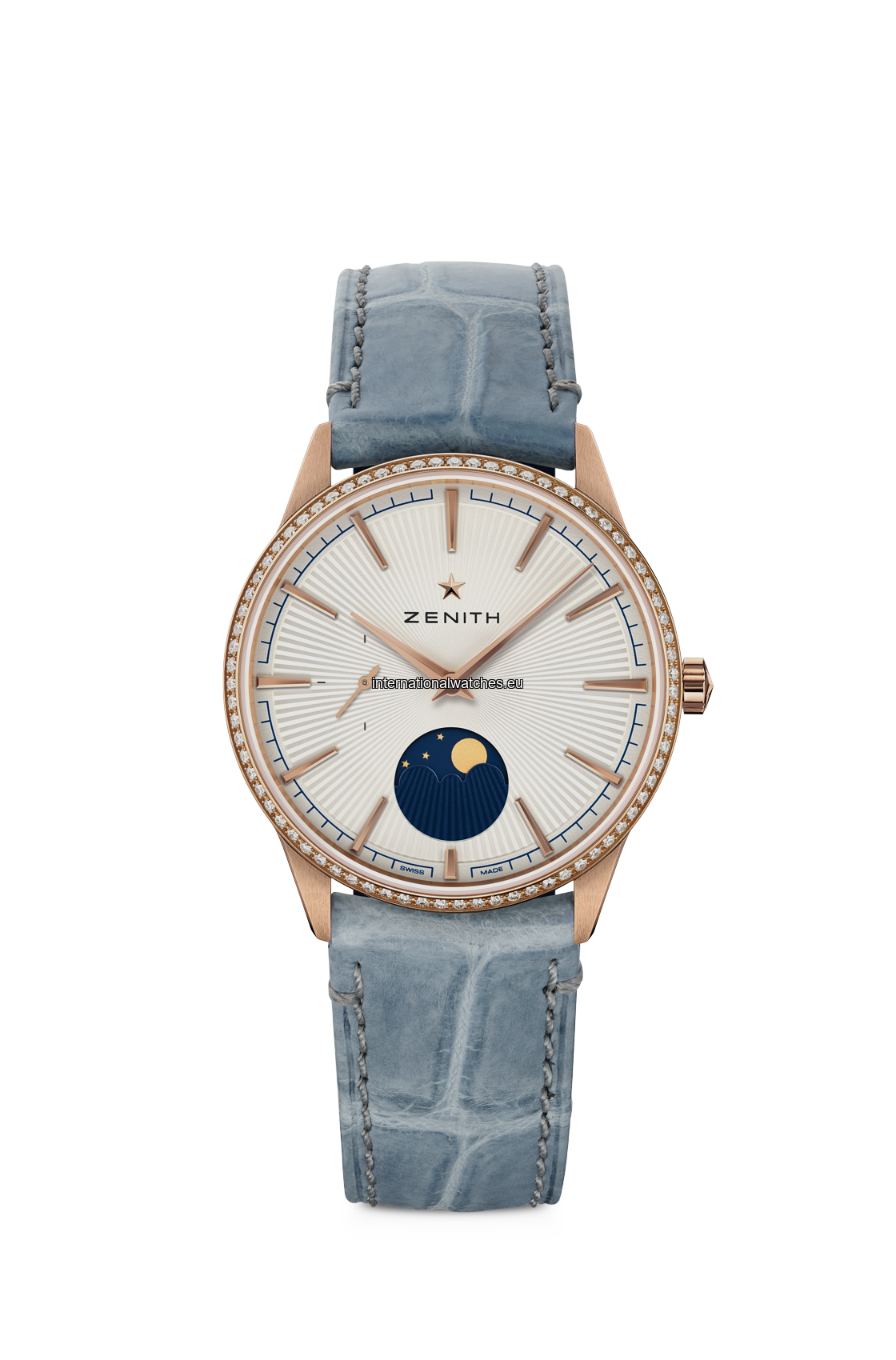 The ELITE Moonphase watch is made in a 36mm 18k rose gold case with diamond-set bezel and silver sunray-patterned dial, fitted on a jean blue alligator leather strap. Ultra-thin in its proportions and irreproachable in its performance, the ELITE manufacture calibre provides a power reserve of 50 hours with its automatic winding mechanism.