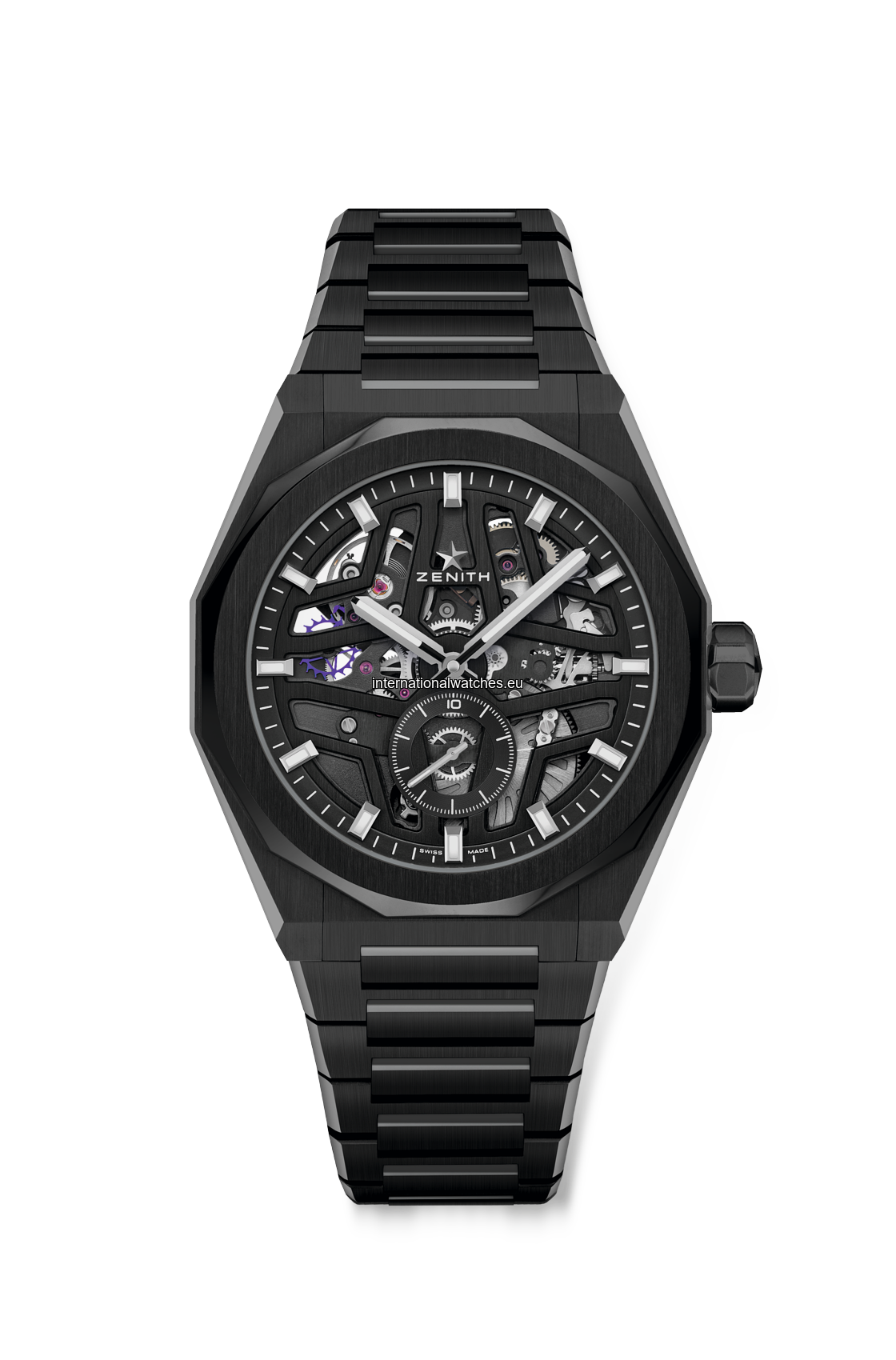 DEFY Skyline Skeleton in a 41mm black ceramic octagonal case with a faceted bezel, featuring a black open dial revisiting the emblematic ZENITH four-pointed star. Powered by the El Primero 3620 SK high-frequency automatic manufacture skeleton movement with the very first 1/10th of a second indicator. Interchangeable ceramic bracelet, with a black patterned rubber strap.