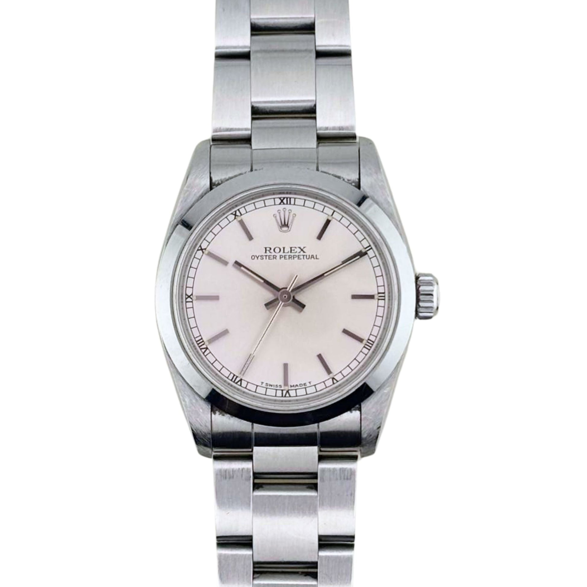 This Oyster Perpetual with a stainless steel Oyster bracelet. Fixed bezel. Silver dial with silver tone hands and index hour markers. Scratch resistant sapphire crystal [SN/T61****]