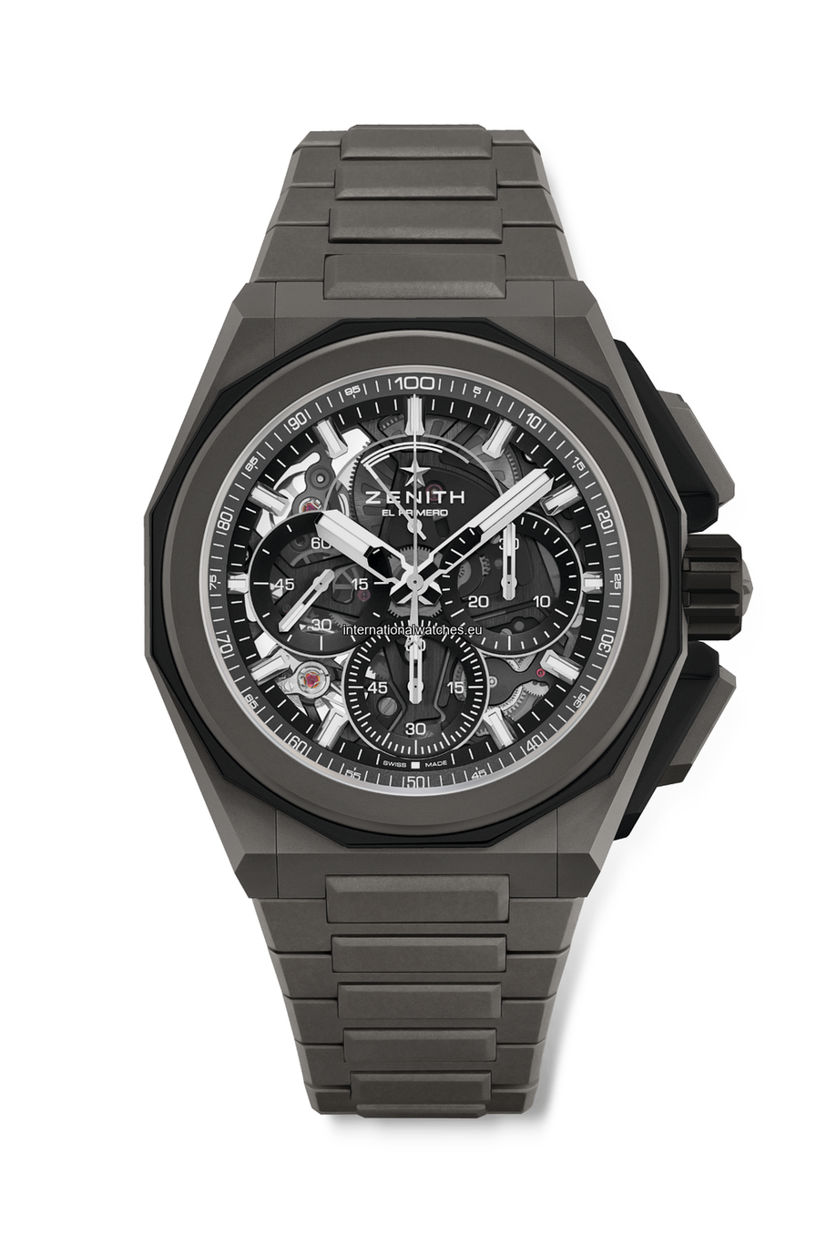 The DEFY Extreme 1/100th of a second chronograph is made in light yet robust titanium with an entirely matte finish. The tinted sapphire dial with applied counters reveals the El Primero 21 automatic movement with two escapements beating at 50Hz and 5Hz. The DEFY Extreme watch comes with a titanium strap as well as a rubber strap and a Velcro strap.