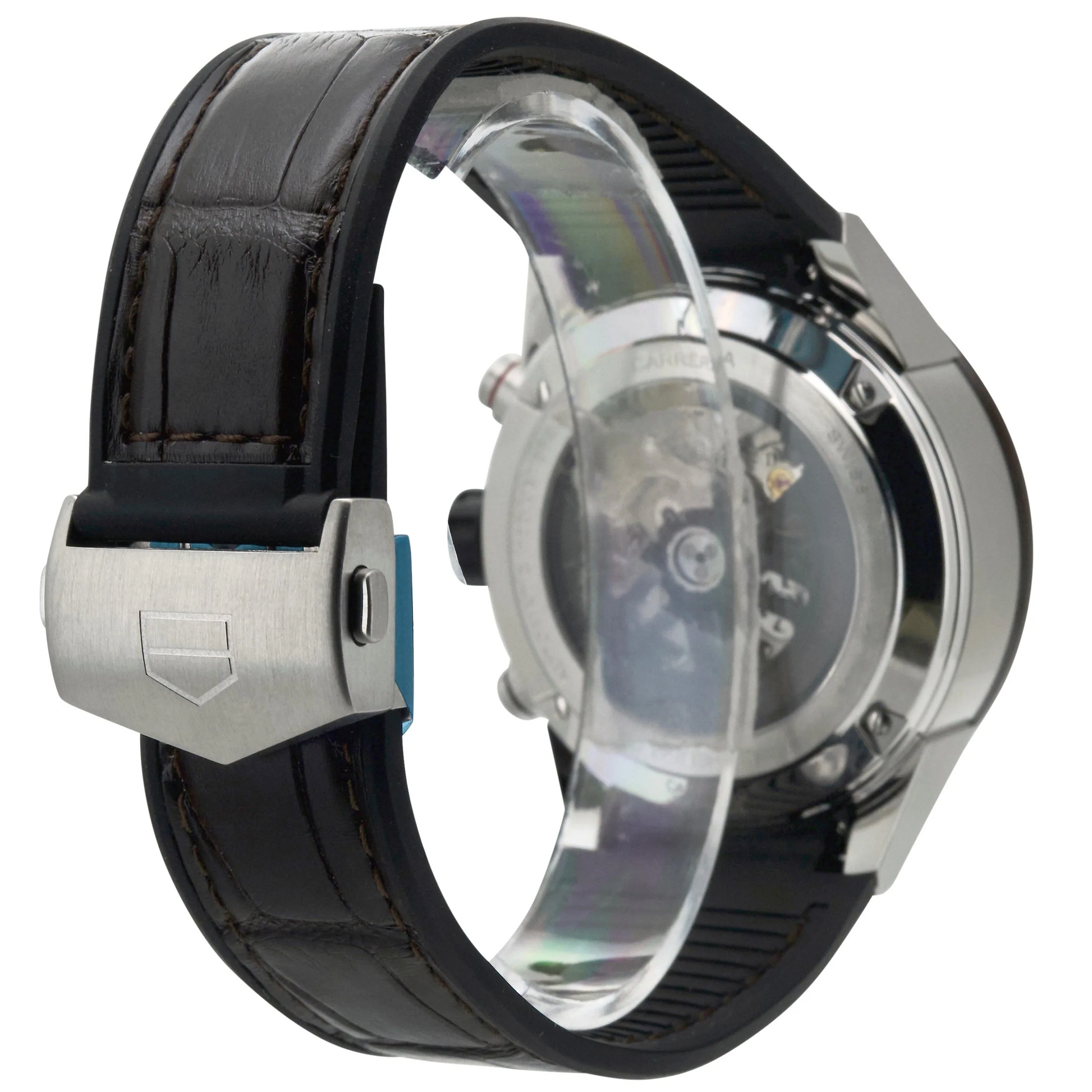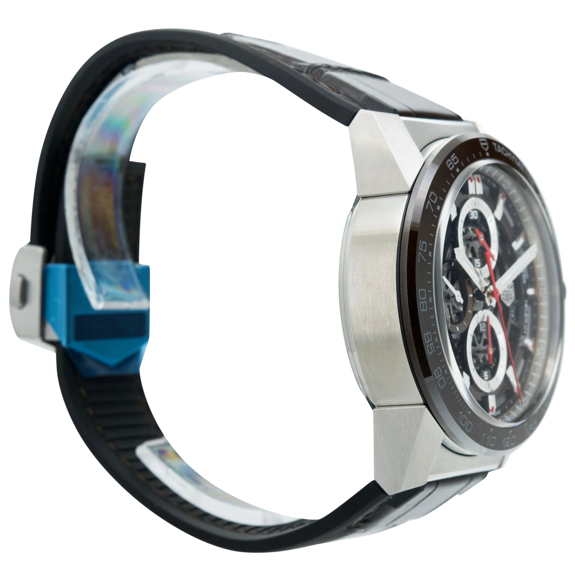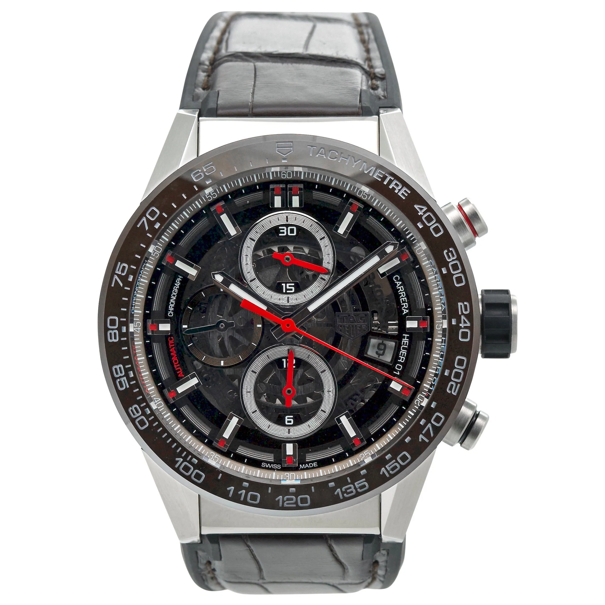 Case: Modular construction. Middle Case & Case Back: Brushed & polished stainless steel. Lugs: Stainless steel with brushed & polished finishes. Bezel: Fine brushed & polished brown ceramic bezel with engraved tachymeter scale. Crown: Satin finished stainless steel with rubber grip. Chrono pushers: Satin finished stainless steel. Dial: Skeletonized with brown & silver rims. Applied brushed & polished steel index hour markers with luminous fill. Fine printed minute, seconds & fractions of a second track on dial flange. Time related hands: polished& sand-blasted finished hands, hour & minutes with luminous fill. Chronograph related hands: red. Brown rimmed small seconds sub-dial located at the 9 o'clock position. Date disc with black plated skeletonized date numbers, white background located between the 3 & 4 o'clock position to indicate the current date. Chronograph/Stopwatch functions: Column-Wheel Chronograph metallic red column wheel visible via case back. Large red central seconds hand counter. Silver rimmed 12 hour counter subdial located at the 6 o'clock position. Silver rimmed 30 minute counter sub-dial located at the 12 o'clock position. Skeletonized Tag Heuer Caliber Calibre HEUER 01: Beats at 28,800 vph, contains 39 Jewels. Approximate power reserve of 50 hours or +/- 40 hour if the chronograph function is running. Blackened steel bridges on movement top. Black treated rotor with red text.